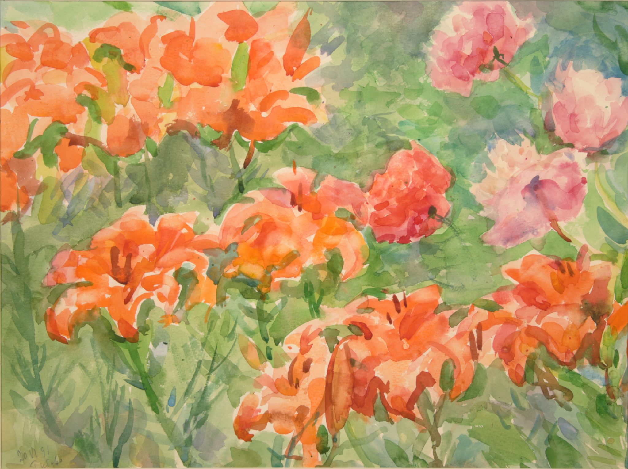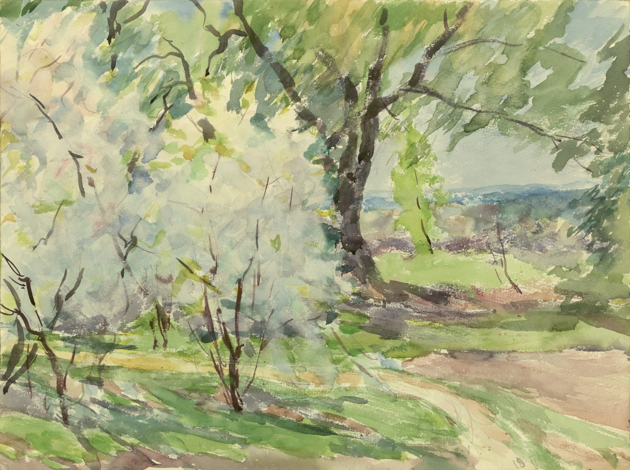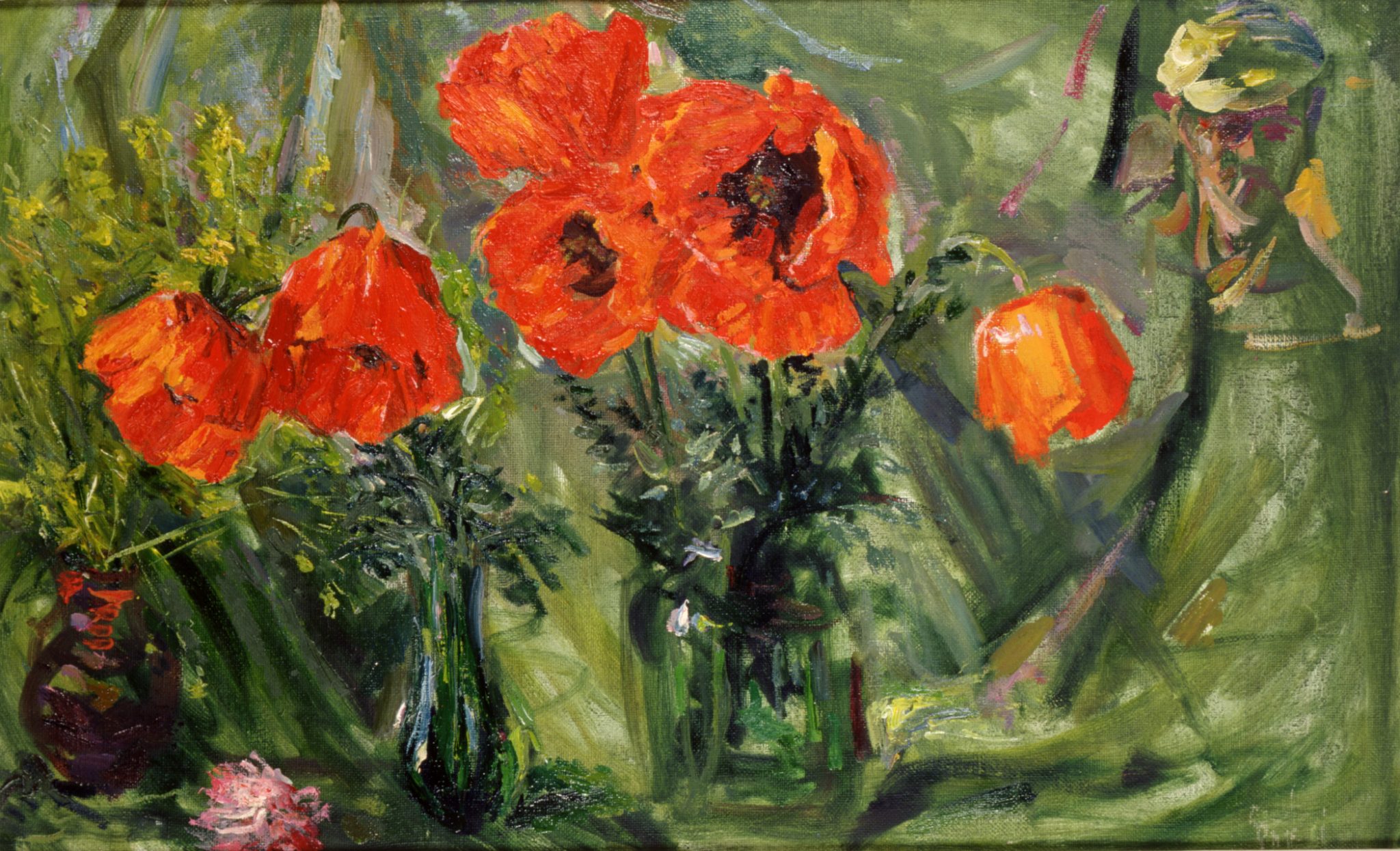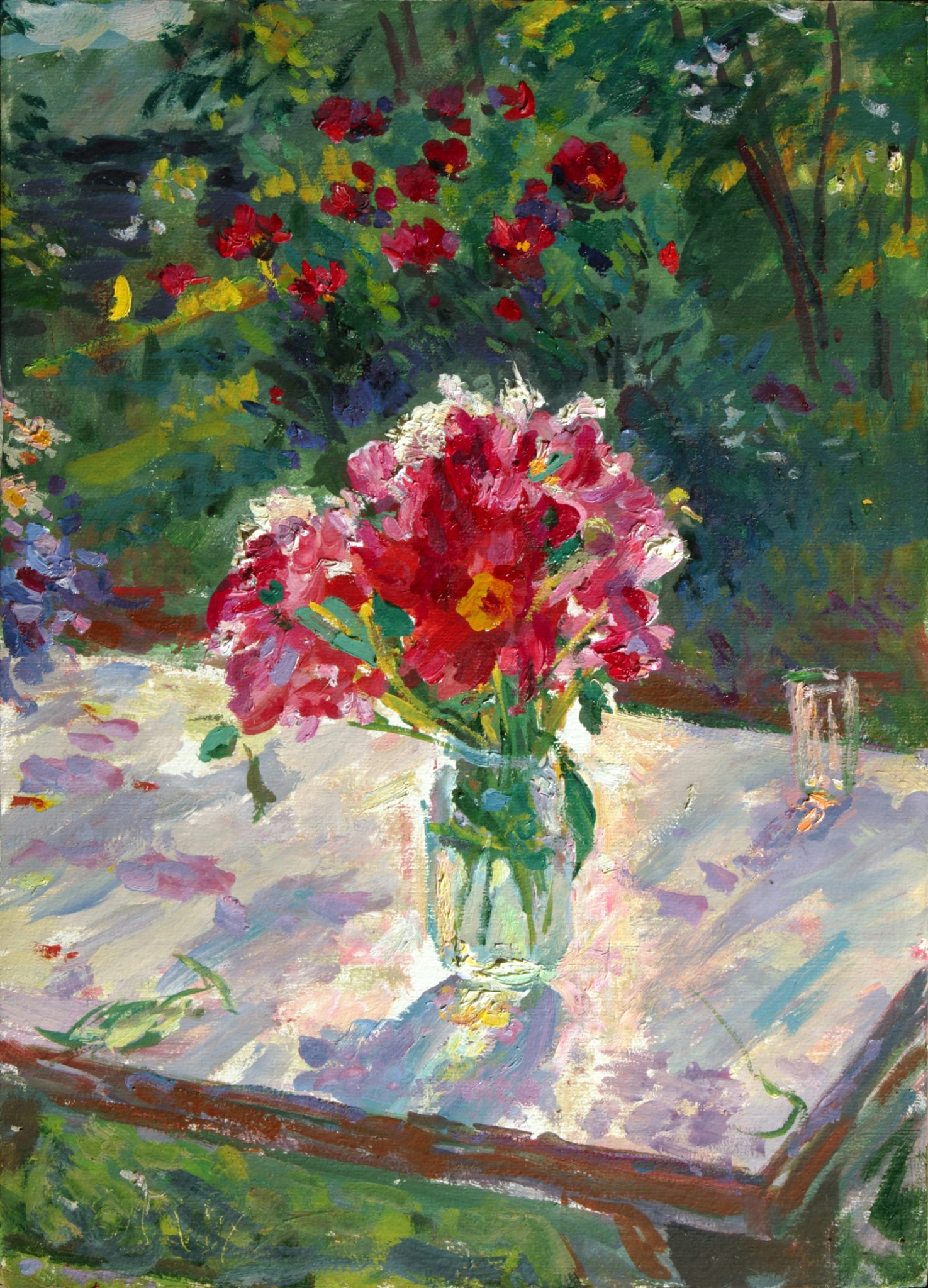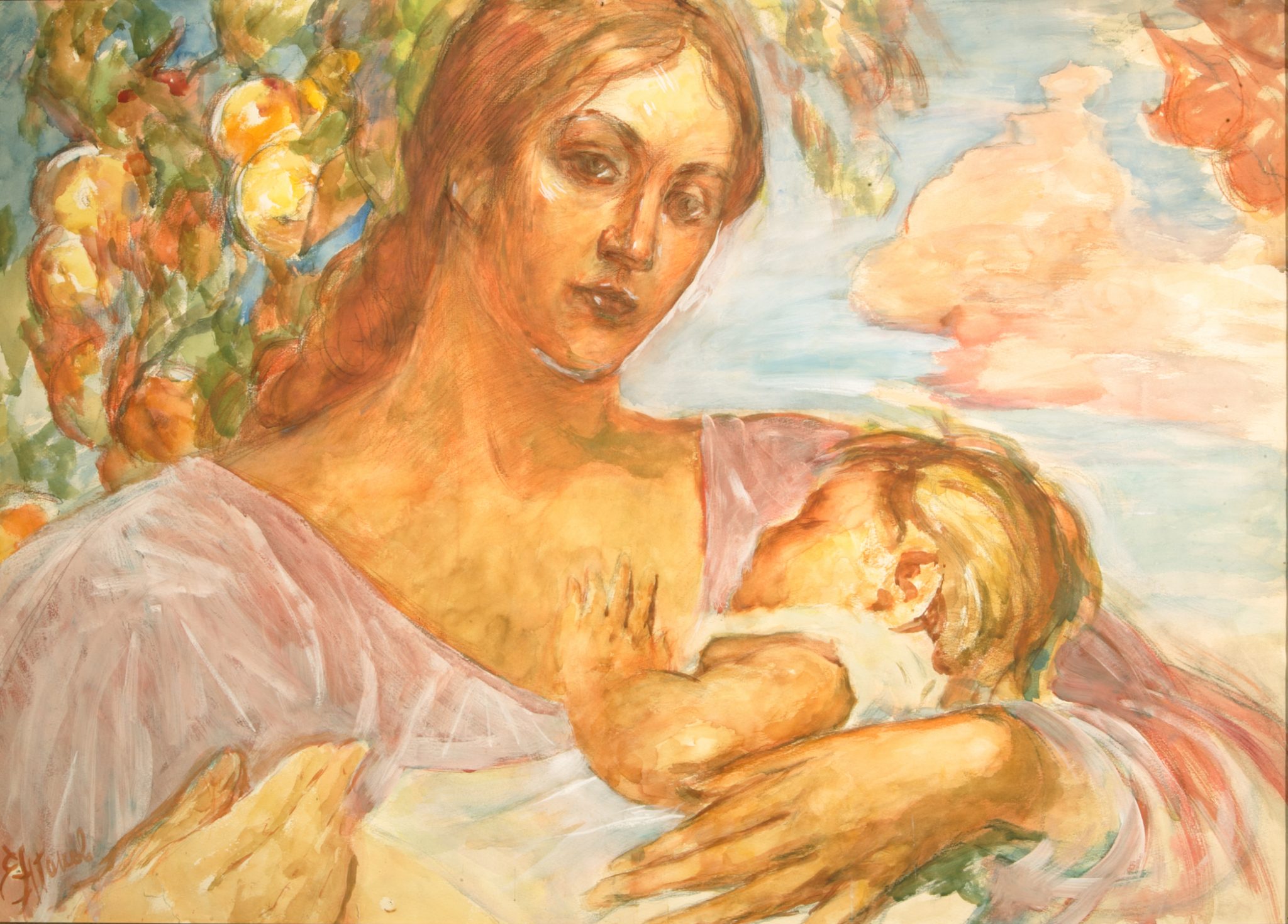 Художник писал не только людей, довольно значительную часть его творчества составляют пейзажи. Мне бы хотелось подробнее остановиться на картине «Ветка яблони». На первый взгляд в ней нет ничего особенного, но интерес появляется, если посмотреть на дату создания – 1996 год. Меньше чем через два года Антонов умер. И тогда ветка на переднем плане, которая от тяжести плодов низко склонилась к земле, смотрится не так плоско. В ней художник мог запечатлеть себя. За довольно долгую жизнь он оставил большое наследие картин-плодов, он устал от этого груза, у него него не осталось сил нести бремя своего творчества и продолжать расти все выше к голубому небу. Он «падает» на землю, отдавая все свои полотна нам, людям.
