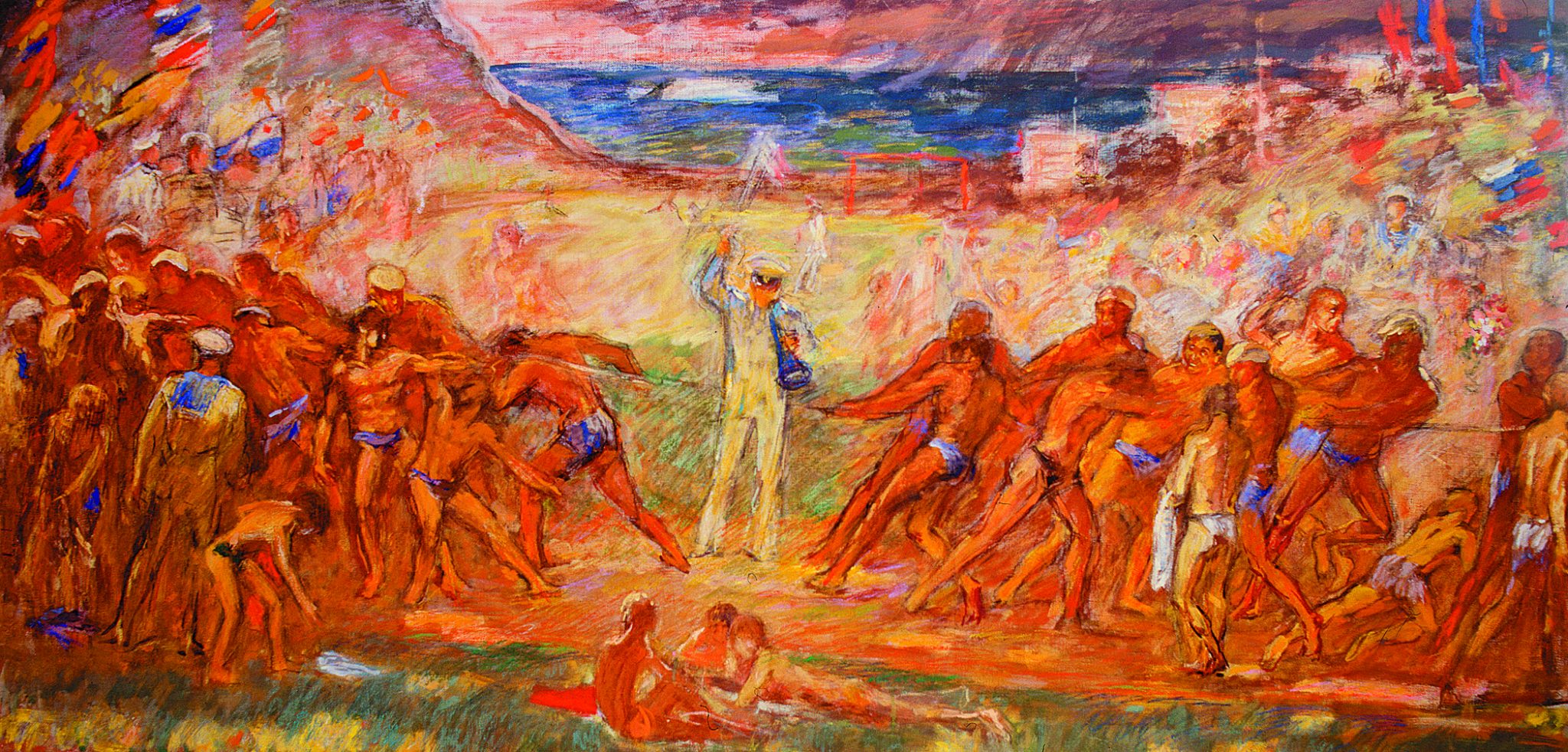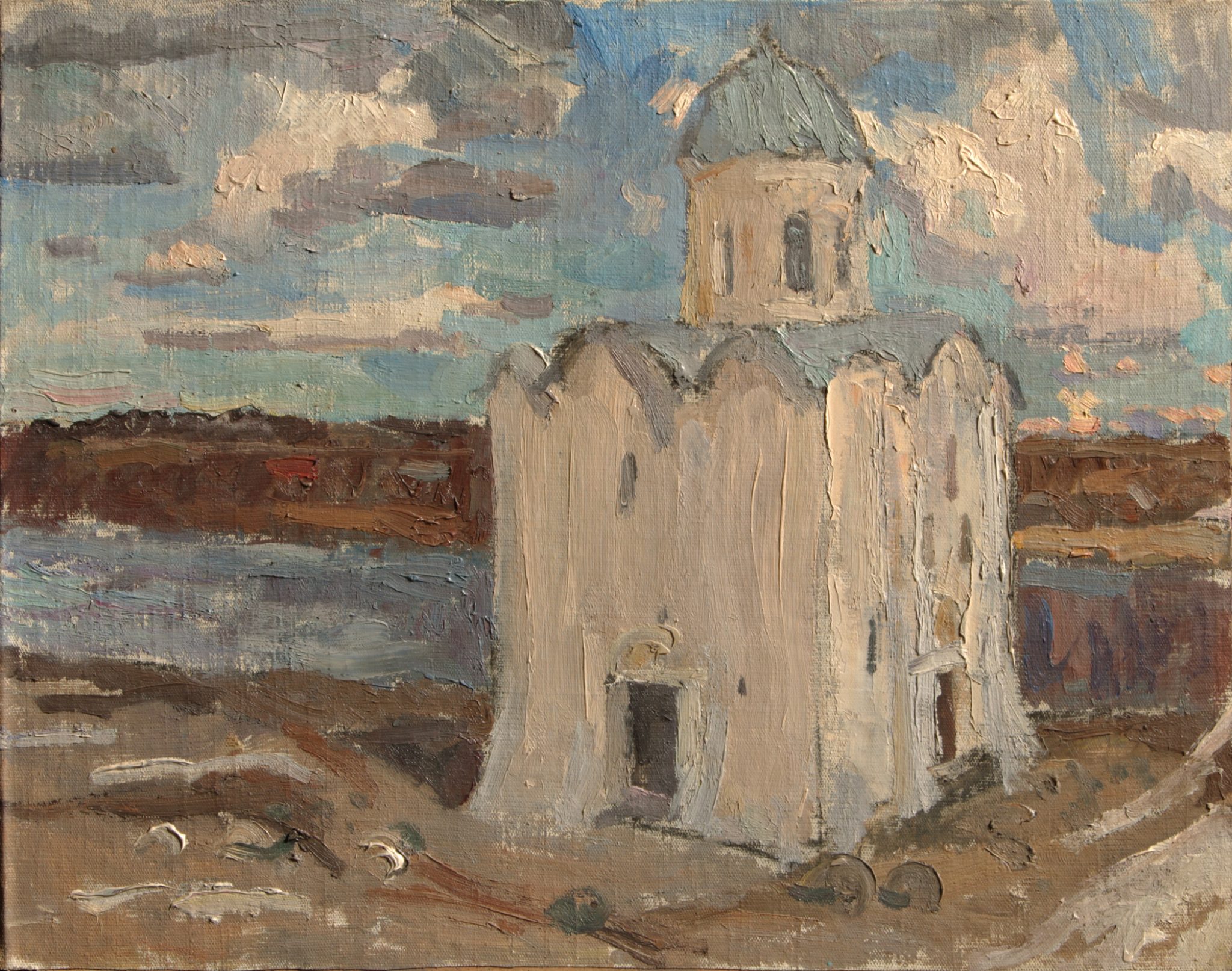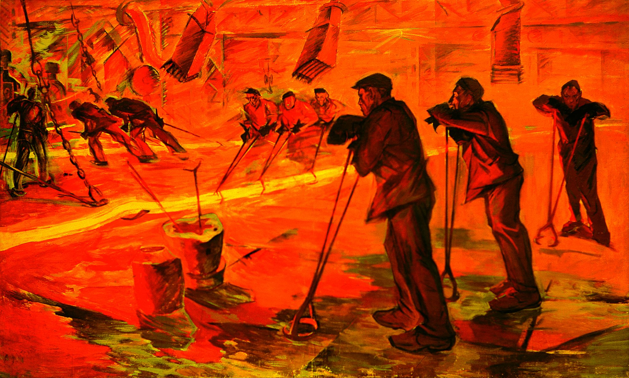 На примере трех картин с названием «Солдаты революции» можно проследить как менялась не только техника художника, но и его мысли по поводу всего сюжета. Первый вариант был написан в 1955 году, в ранний период творчества. Здесь фигуры и здание размыты, половину холста занимает темное небо. О нем сложно что-либо сказать, перед нами только эскиз композиции, которая в дальнейшем осталась практически неизменной.