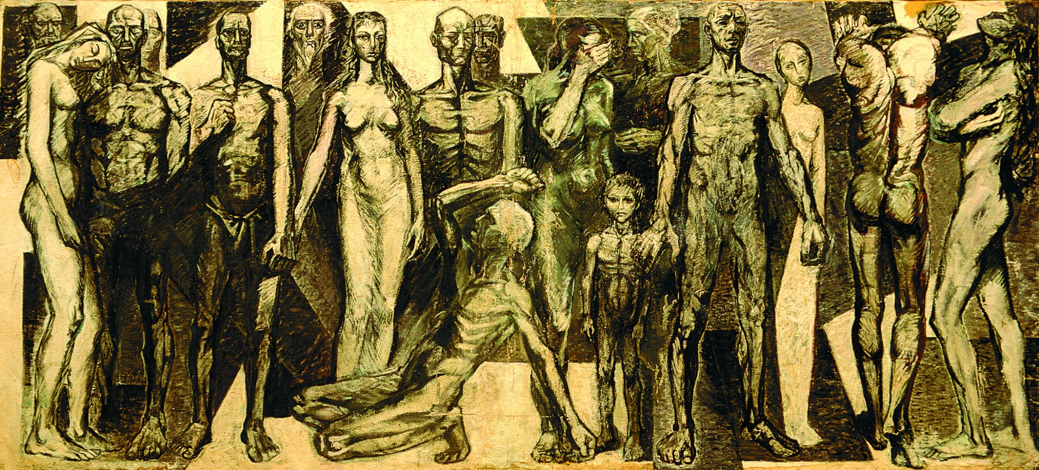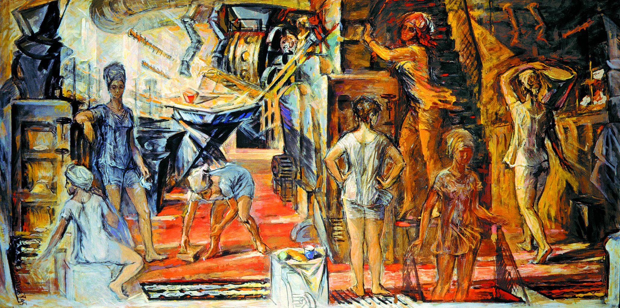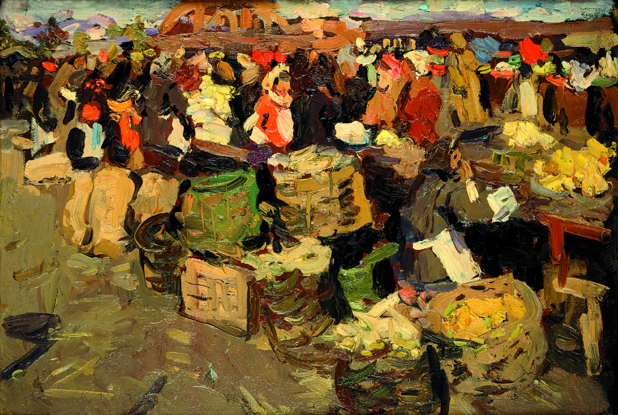 На примере трех картин с названием «Солдаты революции» можно проследить как менялась не только техника художника, но и его мысли по поводу всего сюжета. Первый вариант был написан в 1955 году, в ранний период творчества. Здесь фигуры и здание размыты, половину холста занимает темное небо. О нем сложно что-либо сказать, перед нами только эскиз композиции, которая в дальнейшем осталась практически неизменной.