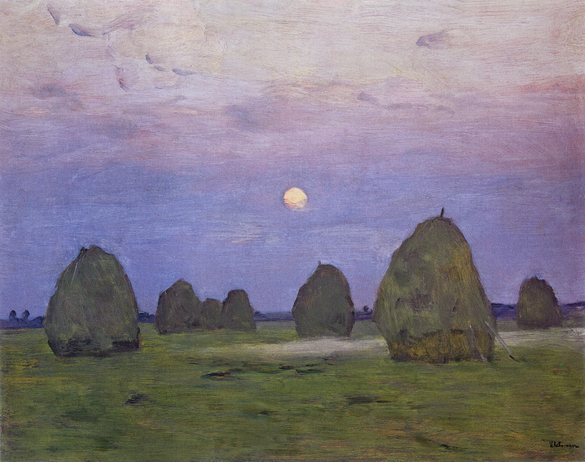 Жизнь художника завершалась, но он продолжал работать, ясно осознавая близость конца. В это время Левитан то обращался к спокойным и привычным деревенским пейзажам и написал «Лунная ночь. Деревня», «Тишина» и «Сумерки. Стога», чтобы «монументализировать дыхание земли».