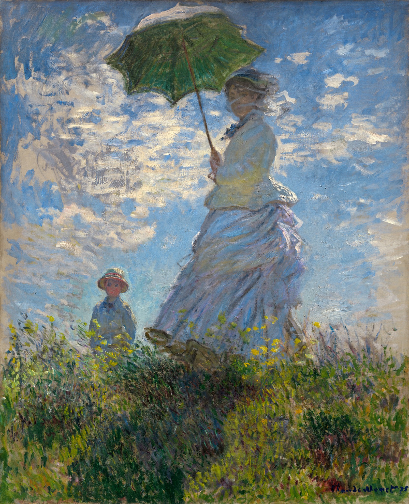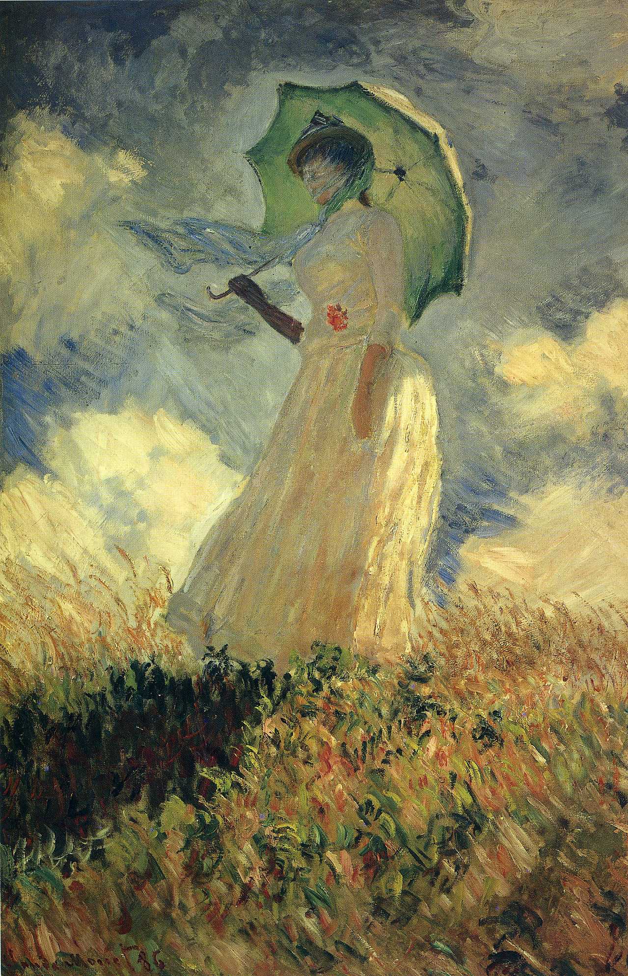 Одна из старших дочерей — Сюзанна — обладала столь редкой красотой и грацией, что однажды, случайно приметив ее, стоящую на холме с зонтиком, Моне решительно заявил, что завтра же она будет ему позировать. На следующий день они вдвоем вновь вернулись на тот холм, поросший травой и летними цветами и художник написал сразу две картины: «Женщина с зонтиком, повернувшаяся налево» и «Женщина с зонтиком повернувшаяся направо».