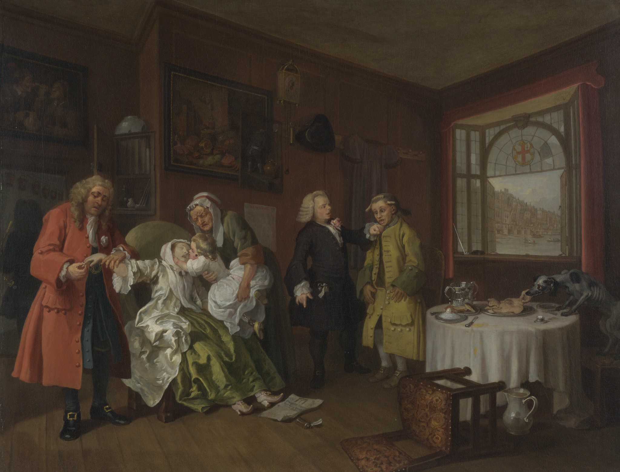 Чаще всего Уильям Хогарт выстраивает сатиру на противопоставлении названия картины с происходящим на ней. Это, например, очень удачно сработало в серии картин «Модный брак», и они стали весьма популярными у современников художника. В шести картинах Хогарт рисует семейную жизнь пары из высшего общества. Все начинается с заключения брачного контракта, где герои выглядят вполне адекватно, хотя жених и невеста сидят спиной друг к другу. Дальше в трех картинах нам намекают на неверность обоих супругов, а лица героев становятся комичными. На последних двух полотнах в результате постоянных измен погибает сначала муж, а затем и жена. На последней картине с матерью прощается маленькая дочь, оставшаяся совсем одна. На ее лице и ноге можно разглядеть черные пятна, что является признаком сифилиса.