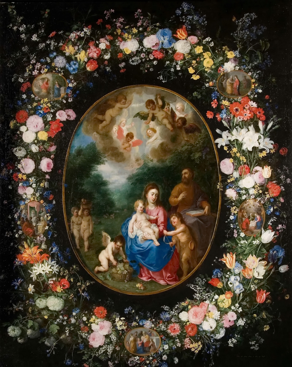 На многих полотнах религиозной тематики — венки из роз, символа объединения всех христиан, а также обрамление из цветочной гирлянды. Таковы «Богородица, младенец Иисус и ангелы в цветочной гирлянде» (ок. 1616-1617) — совместная работа фламандцев Питера Пауля Рубенса (1577-1640) и Яна Брейгеля (Старшего) (1568-1625) и «Святое семейство с Иоанном Крестителем в цветочной гирлянде» Яна Брейгеля (Младшего) (1601-1678) в соавторстве с Хендриком ван Баленом.