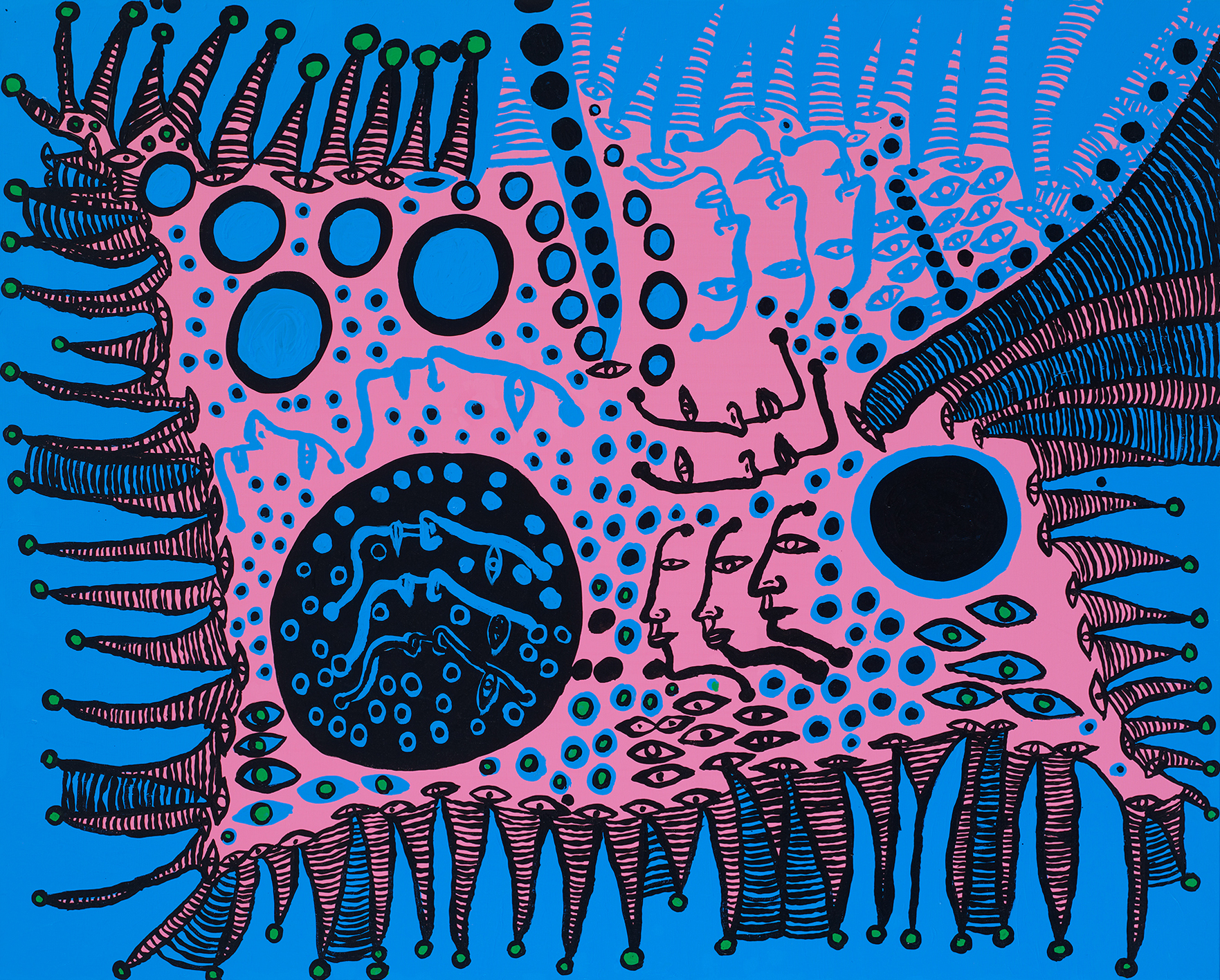«Как-то раз я смотрела на скатерть в красный горошек и вдруг увидела, что и потолок, и подоконник, и стены комнаты, и мое тело — вся Вселенная — покрыты этим красным горошком. Мне захотелось превратиться в ничто. Живопись стала единственным спасением», — вспоминает Яёи.