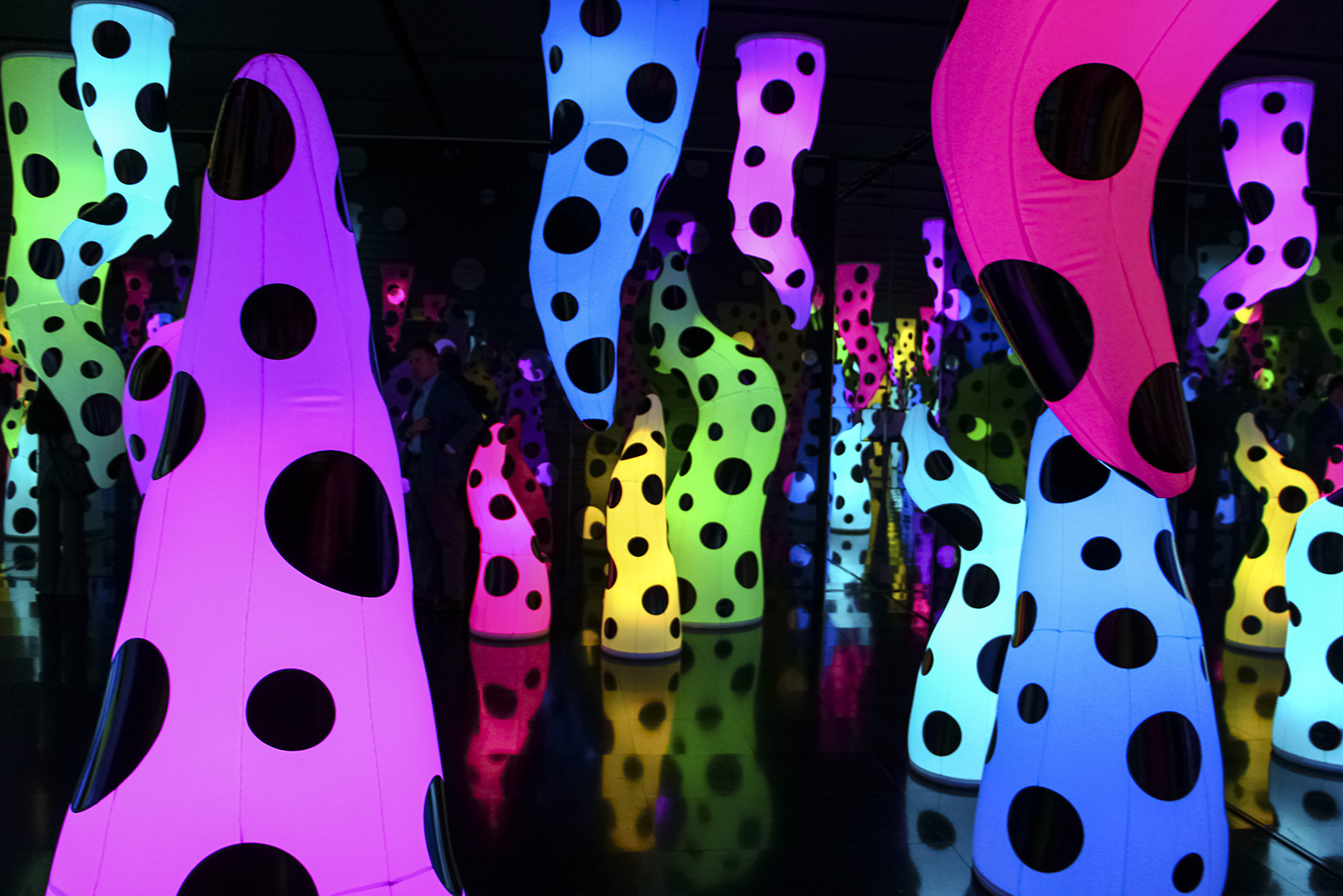 Не так давно в московском Музее современного искусства «Гараж» прошла выставка «Яёи Кусама: теория бесконечности». На ней можно было увидеть чудеса изменения восприятия. Выставка включала в себя две работы-инсталляции художницы. Первая — «Бесконечная зеркальная комната» — представляла собой темное помещение с зеркальными стенами, полом и потолком. Оно было заполнено огромным количеством мерцающих частиц, которые отражались в зеркалах и, казалось, были повсюду. Работа пробуждала в посетителях необычное чувство: безмерности и необъятности пространства. Второе произведение — «Указатель в бесконечное пространство» — представляло собой комнату со своеобразным красным ландшафтом. Она была разрисована белым горошком, который изменял привычные пространственные ориентиры посетителей.