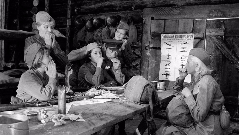 В знаменитой картине Ростоцкого «А зори здесь тихие» по-настоящему щемящим моментом является противостояние женщин и войны. В этом фильме осуществляется своеобразный моральный эксперимент: готова ли на жестокость та, которая создана для любви? Девушки имеют свою особенную историю любви, которая представлена в ленте короткими флэшбэками, то есть воспоминаниями. А одна из них, Бричкина, влюбляется в старшину Васкова. Когда убивают Женю, городскую девушку-студентку, то она издает предсмертный крик и Васков догадывается: удар на мужика был рассчитан. Грудь помешала. Могла детишек рожать.