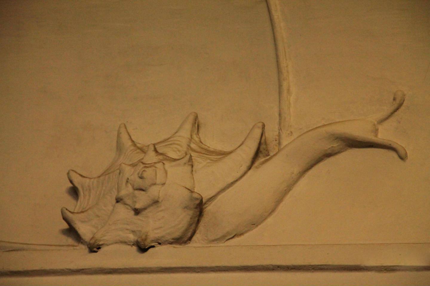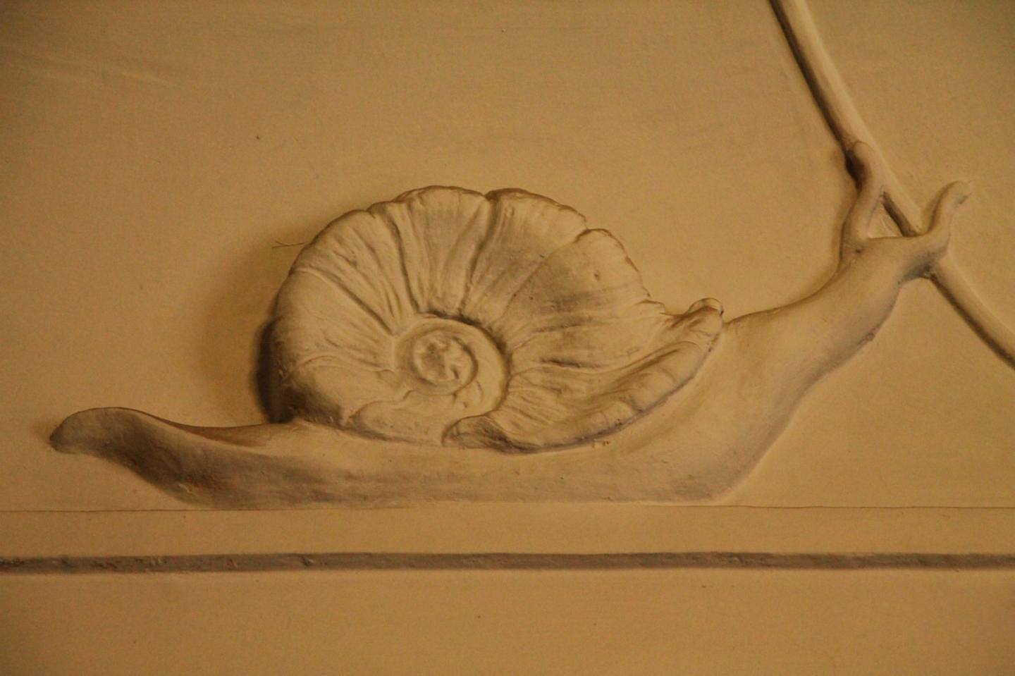 В них встречает идеальный мир гармоничного существования человека и природы. По потолкам в изящных изгибах декоративной флористической лепнины ползут меланхоличные, никуда не спешащие и уж точно никуда не опаздывающие улитки, олицетворяя цикличные процессы мироздания и напоминая о ценности терпения и настойчивости одновременно. Витражи с флоральными мотивами — важная часть интерьера, гармонизирующая пространство.