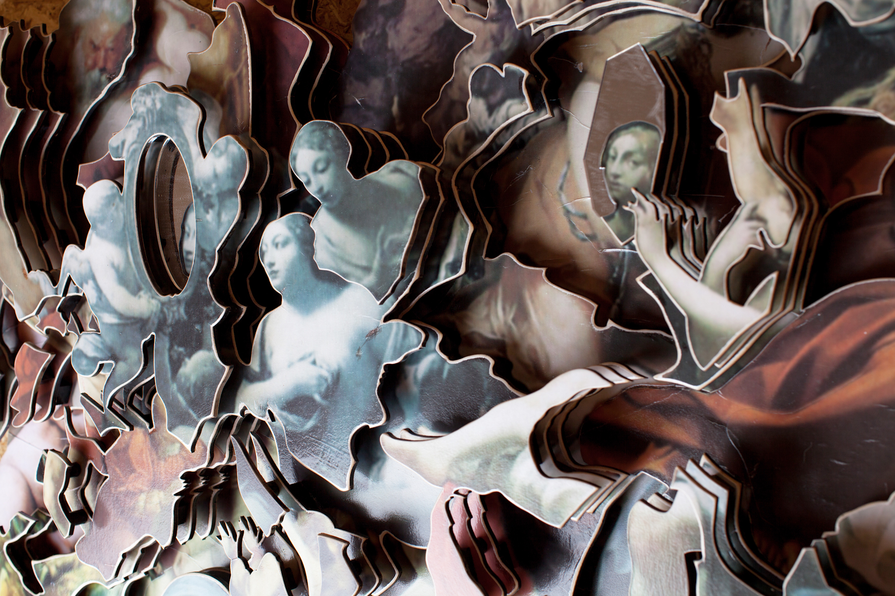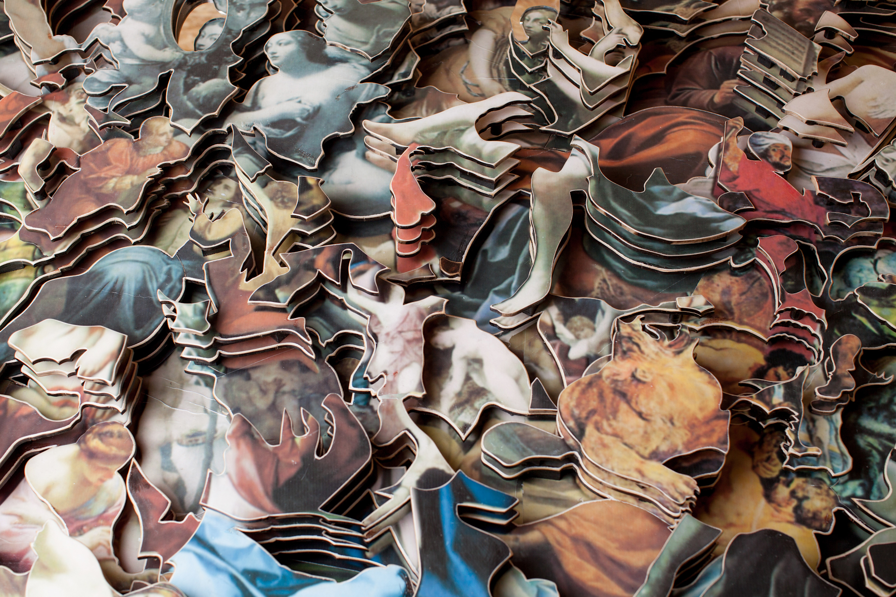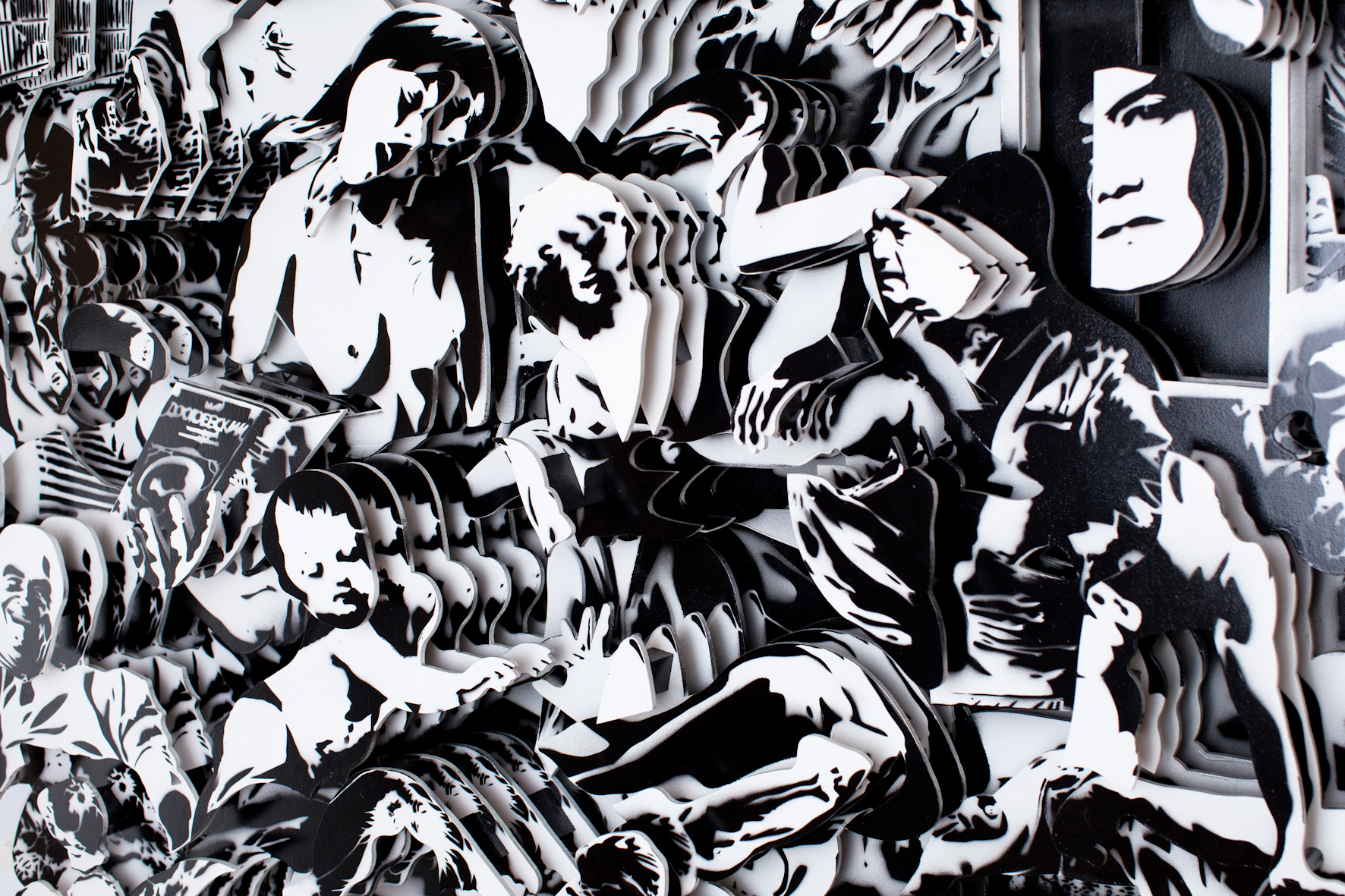 Процесс работы над серией можно разбить на несколько этапов. Сначала я продумываю тему и начинаю собирать материал. Потом выбираю наиболее интересные и подходящие, на мой взгляд, образцы и собираю из них коллажи. В серии «Новое Сообщение» использовались конкретные образы: герои картин, фотографии из газет, рекламные образы и так далее. После того как коллажи готовы, я использую их как макеты для скульптур, перерисовываю формы, готовлю файлы для резки, планирую пространственное расположение.
