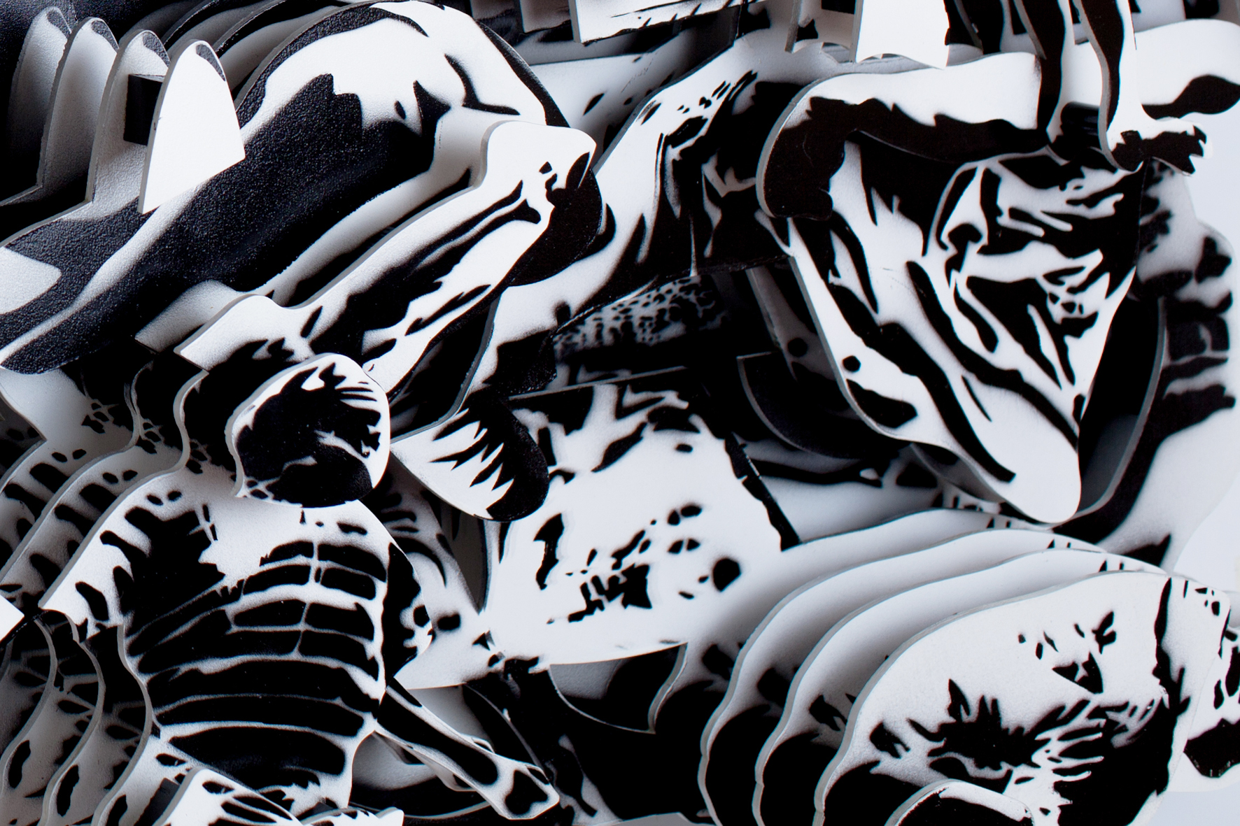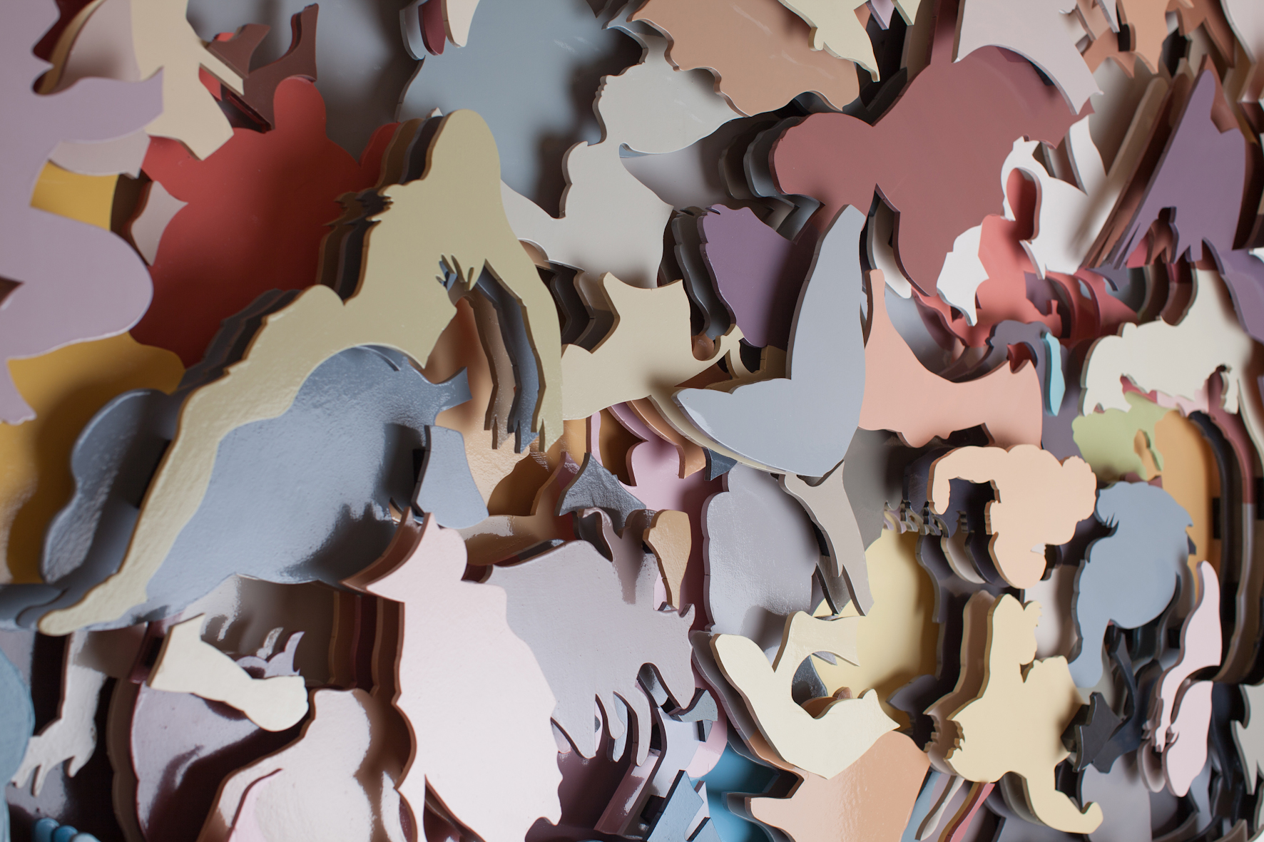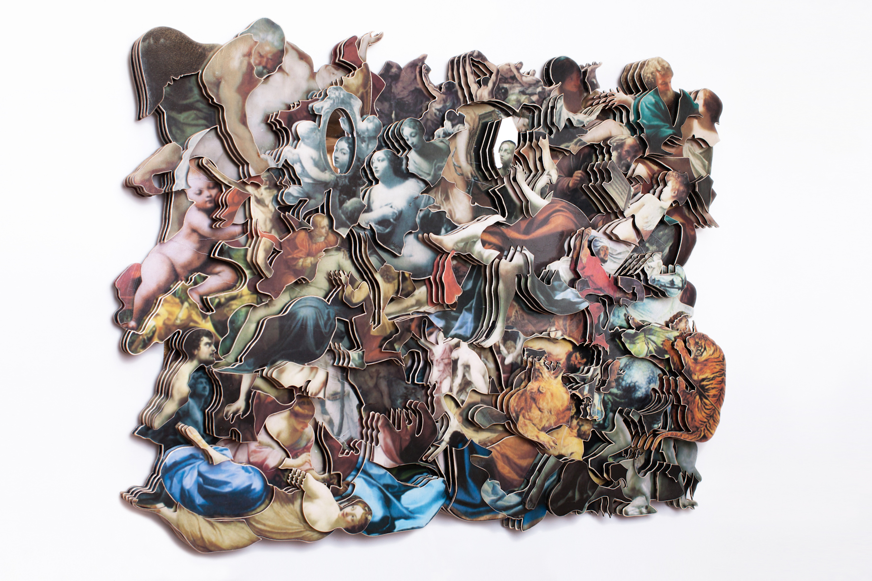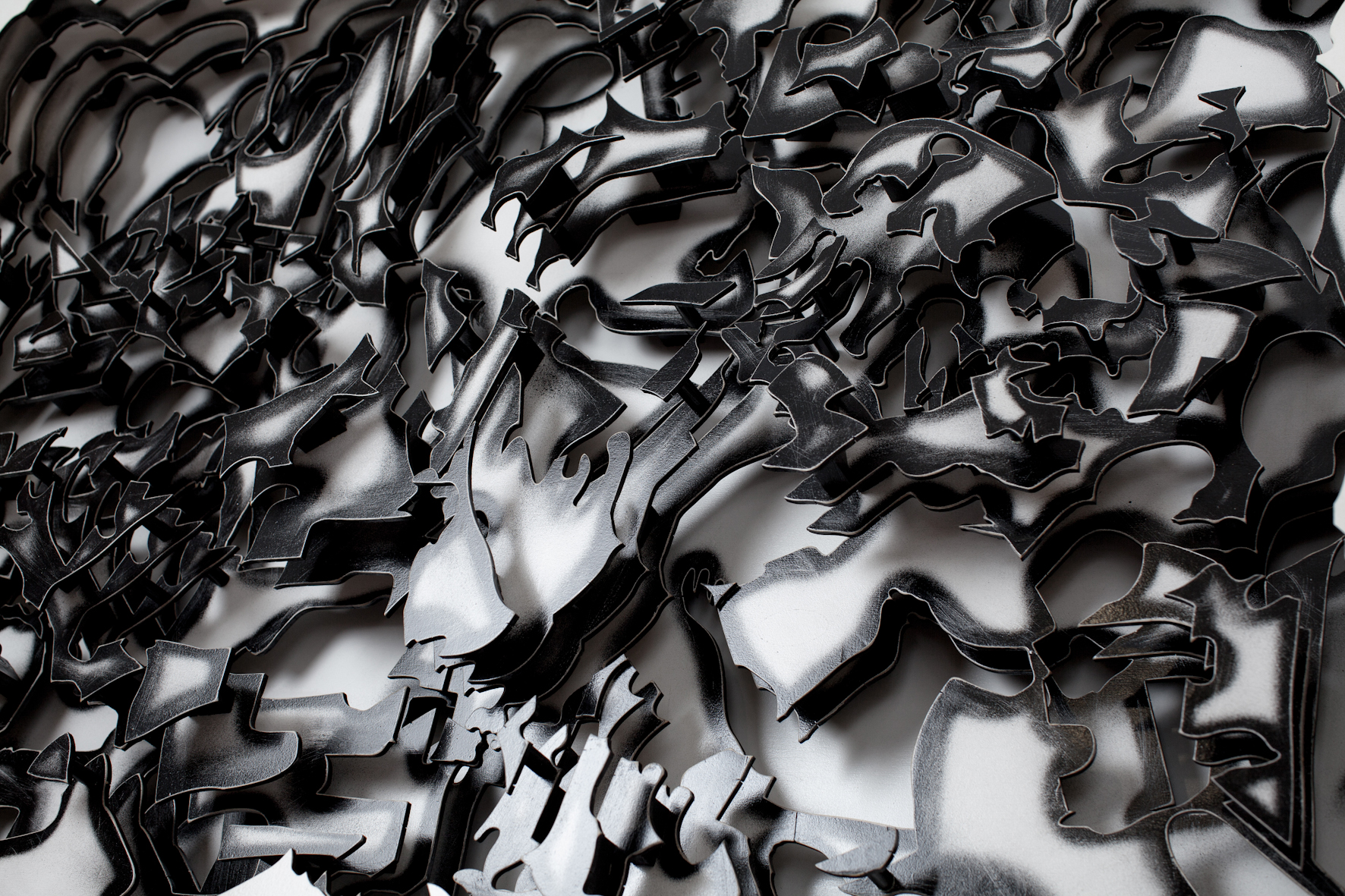 Процесс работы над серией можно разбить на несколько этапов. Сначала я продумываю тему и начинаю собирать материал. Потом выбираю наиболее интересные и подходящие, на мой взгляд, образцы и собираю из них коллажи. В серии «Новое Сообщение» использовались конкретные образы: герои картин, фотографии из газет, рекламные образы и так далее. После того как коллажи готовы, я использую их как макеты для скульптур, перерисовываю формы, готовлю файлы для резки, планирую пространственное расположение.