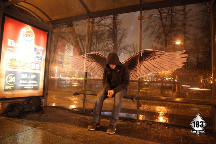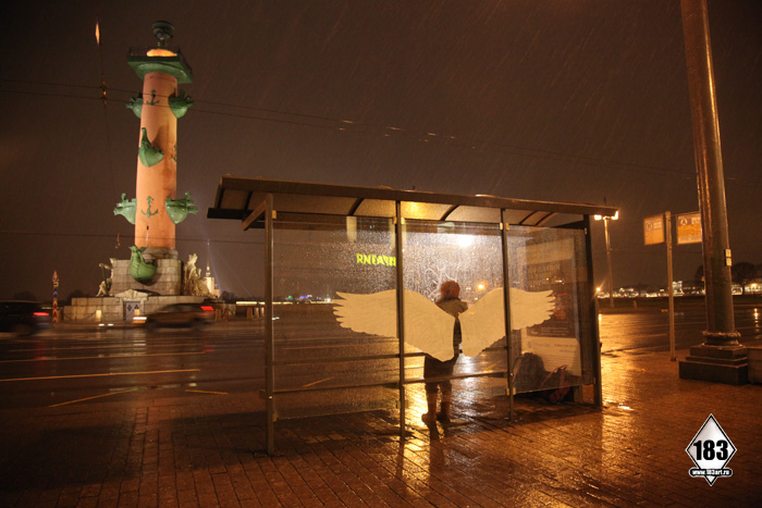 Павел 183 воплощал свои идеи не только в Москве. Художник оставил частичку своего творчества в разных уголках России. Например, посчитав петербужцев «ангелами во плоти», Павел нарисовал на корпусе автобусной остановки крылья (2012 год).