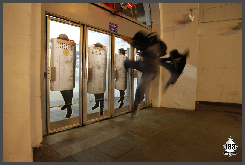 Так, художник с легкостью превратил заснеженное бывшее бомбоубежище в новогодний торт (Преображенская площадь, 2012 год), уличный фонарь - в гигантские очки (2009 год), а двери метро - в фигуры ОМОНовцев (2011 год).