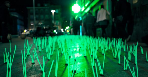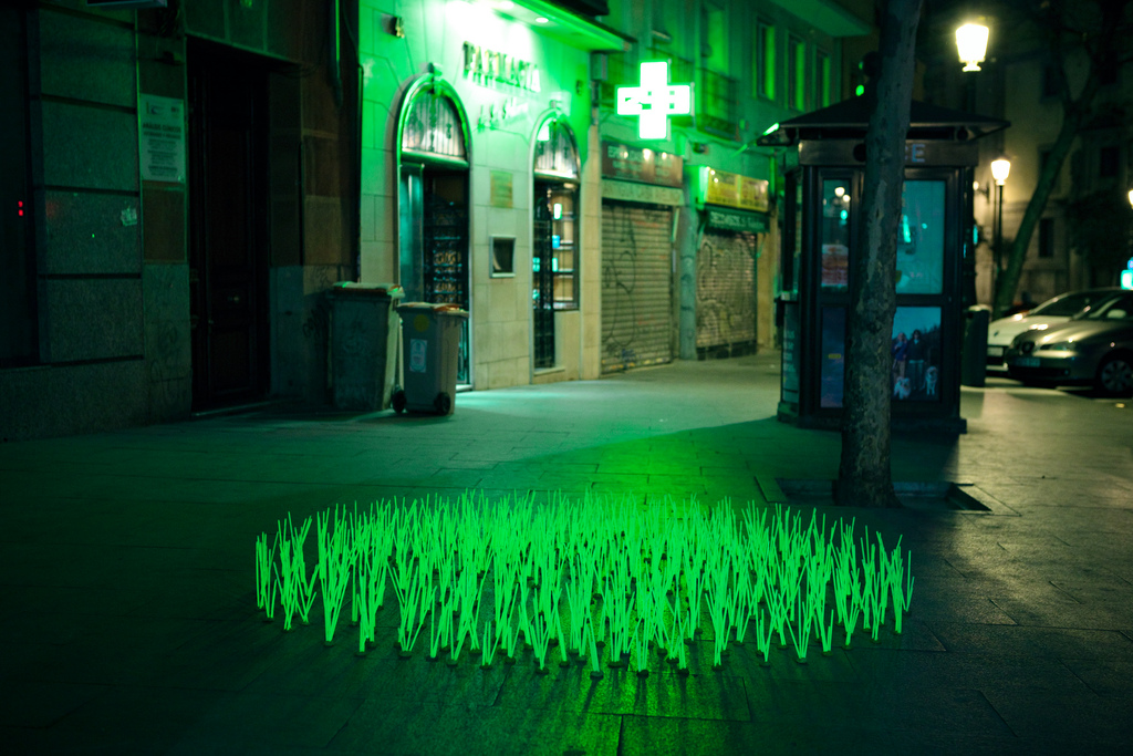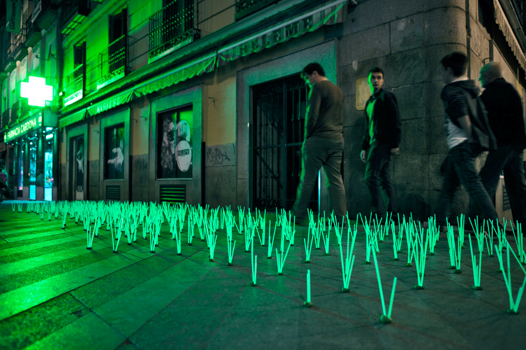 Художники и дизайнеры из Luzinterruptus просто не могли пройти мимо и высадили на улицах инсталляцию из переливающихся ядовито-зеленым светом сорняков-мутантов (Mutant Weeds). Эти «зеленые» островки словно просят у властей города оставить жителям хотя бы небольшой оазис настоящей природы, подальше от неоновых вывесок, огней и прочих прелестей большого города.