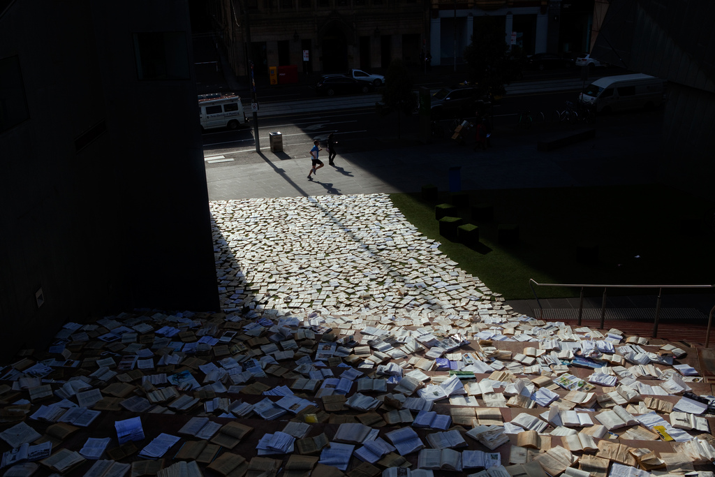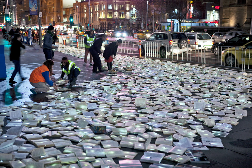 Luzinterruptus креативит и прямо на улицах. Однажды, проснувшись и выйдя по своим делам, жители Мельбурна увидели прямо на дороге огромную полноводную реку из светящихся книг, которые как будто говорили: «Не спеши! Не проходи мимо! Потрогай меня! Прочитай меня!»