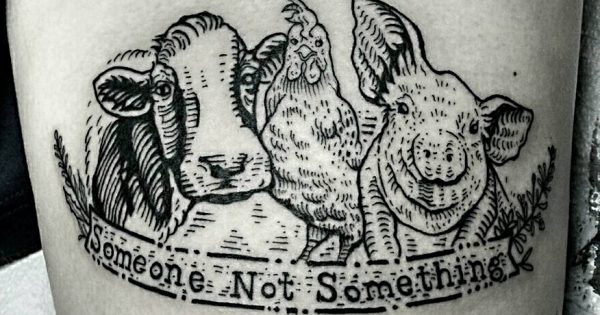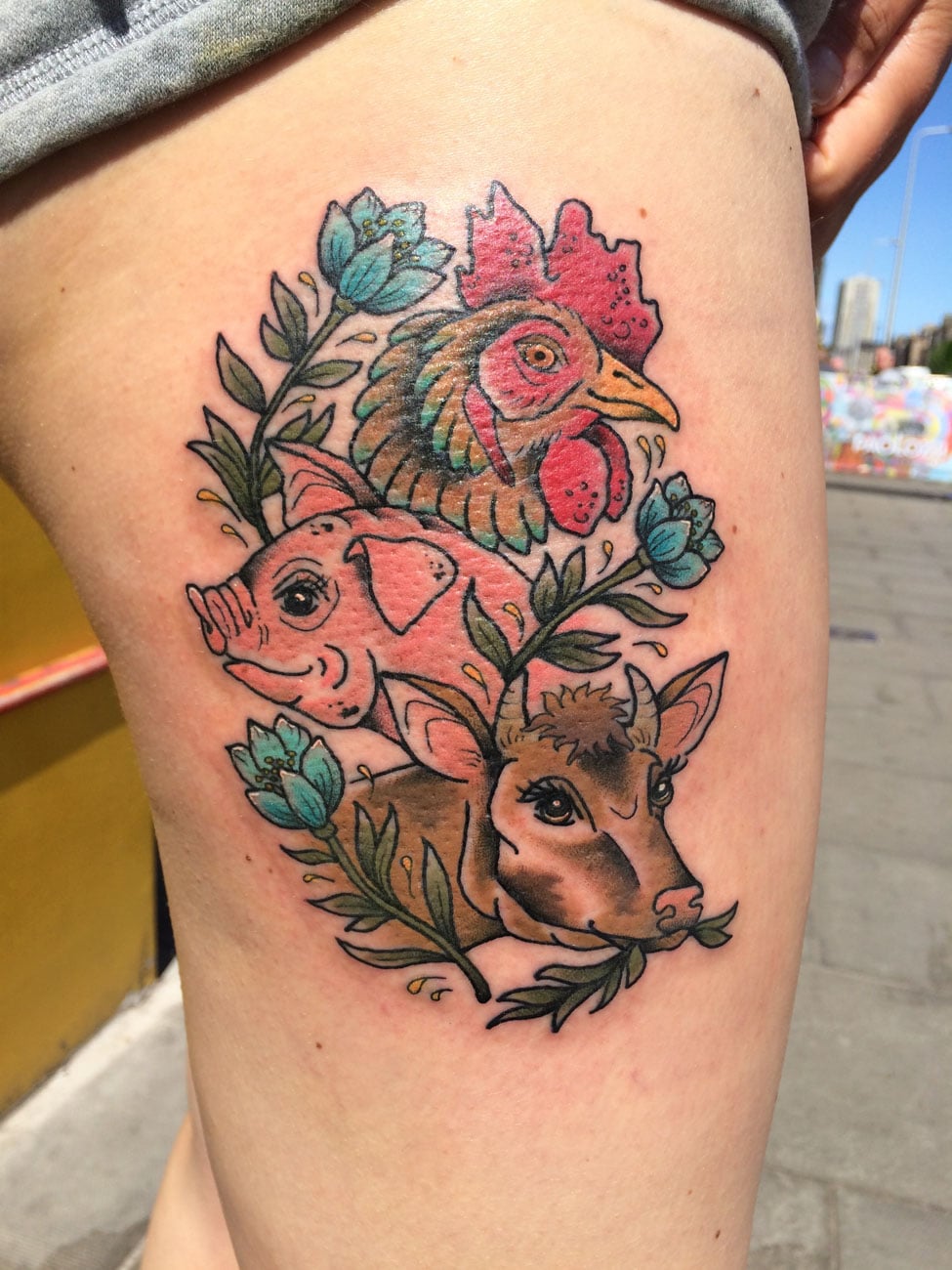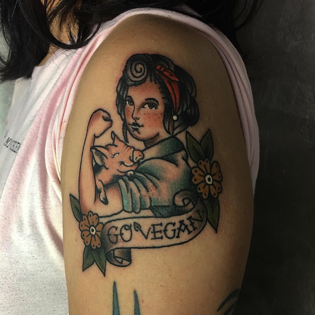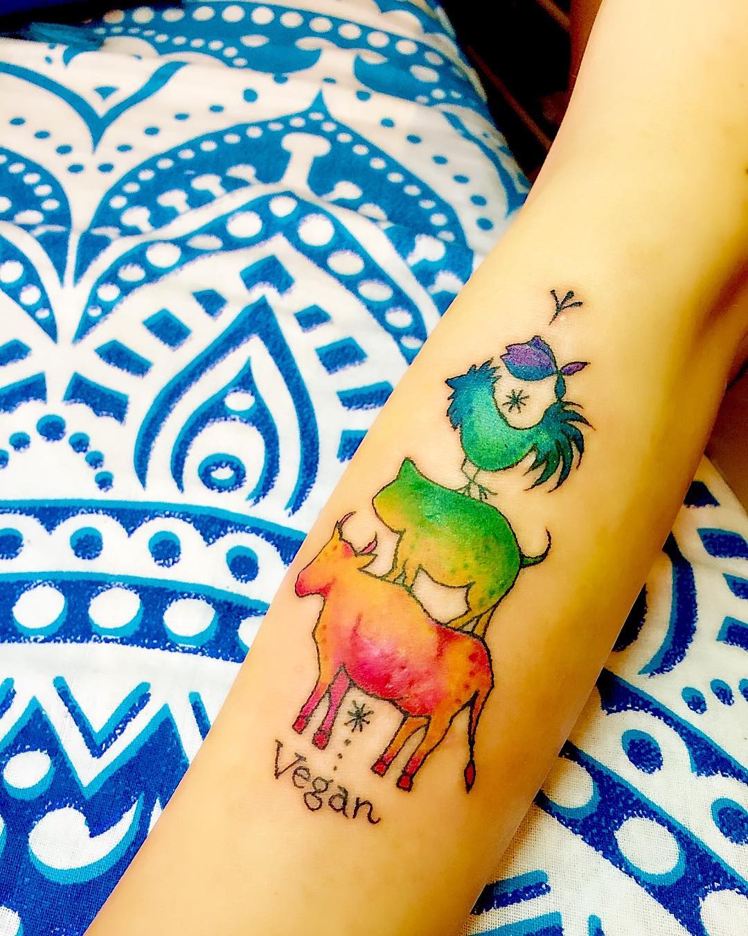 Визуализируется ключевая веганская идея разными способами. Некоторые просто набивают изображения животных (наиболее популярным из которых является свинья/поросенок), иллюстрируя таким образом уникальность и важность жизни каждого представителя. Более по вегану (хе-хе) расположить на теле прямые призывы в защиту животных, дополнив их изображениями тех, кого люди привыкли есть.