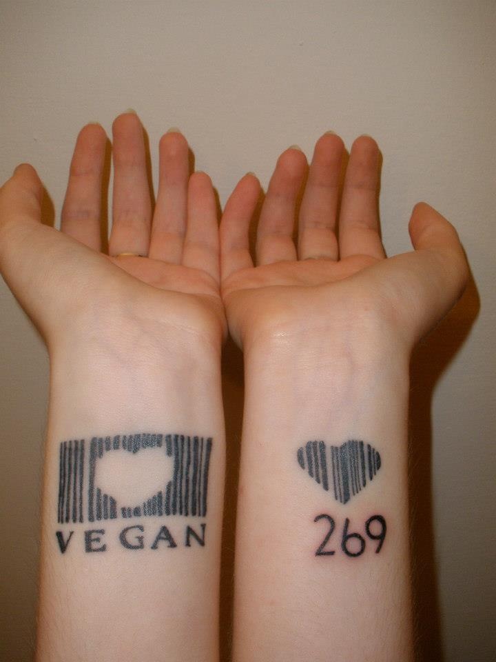 Широкое распространение получила тату с цифрами 269. Что это еще за клеймо, спросите вы? И окажетесь правы. Это число – номер на бирке в ухе теленка, заснятого активистами на одной из крупных молочных ферм недалеко от Тель-Авива. Многие последователи веганства символично «клеймятся» этой цифрой в знак поддержки и отождествления себя со страдающим ребенком коровы, показывая тем самым, что осознают его боль.