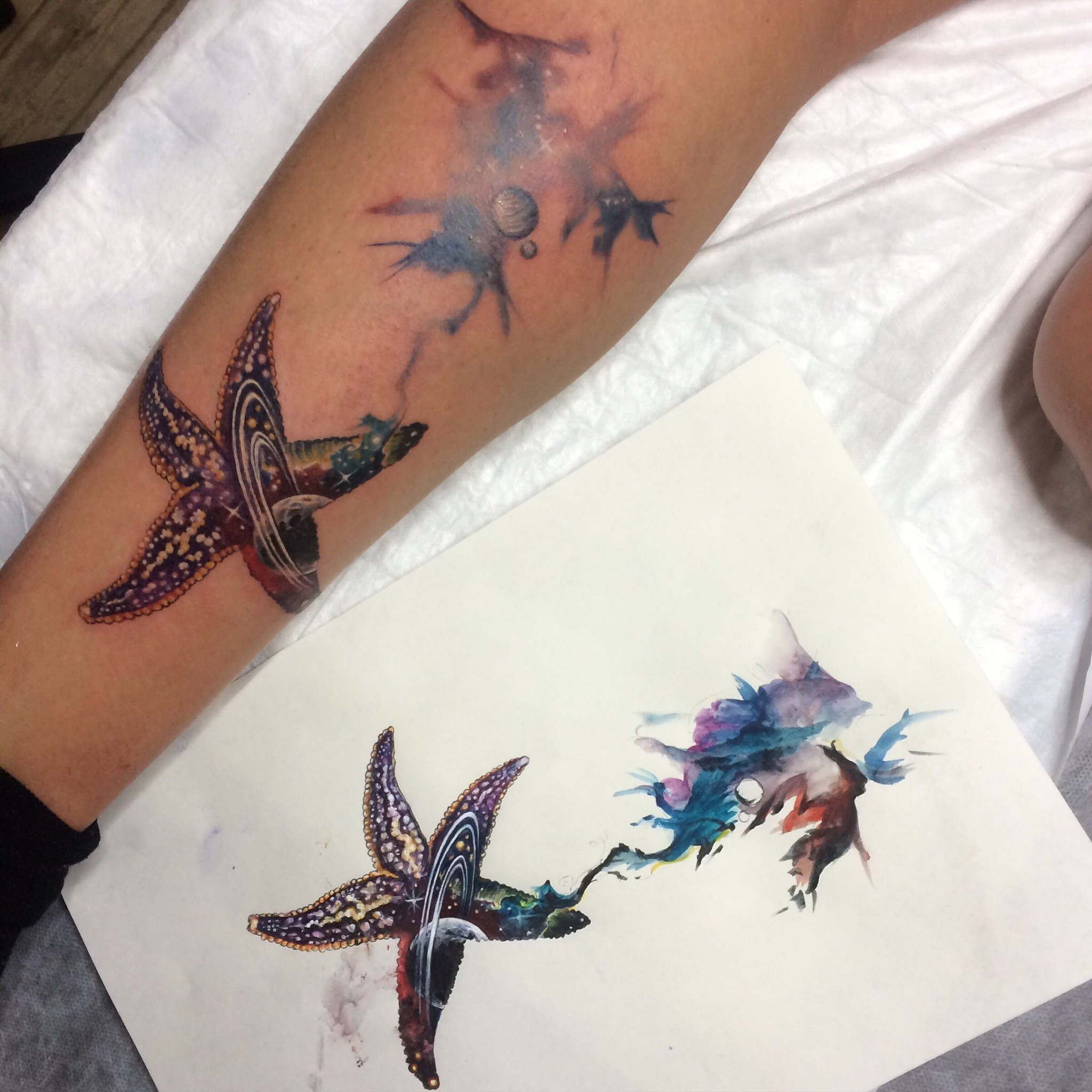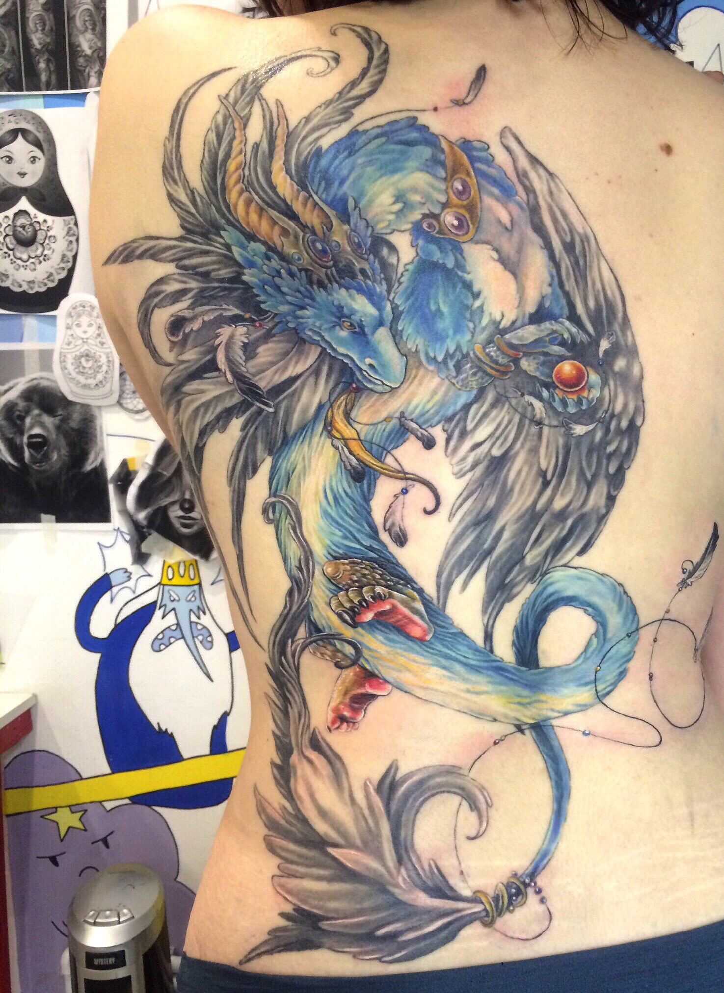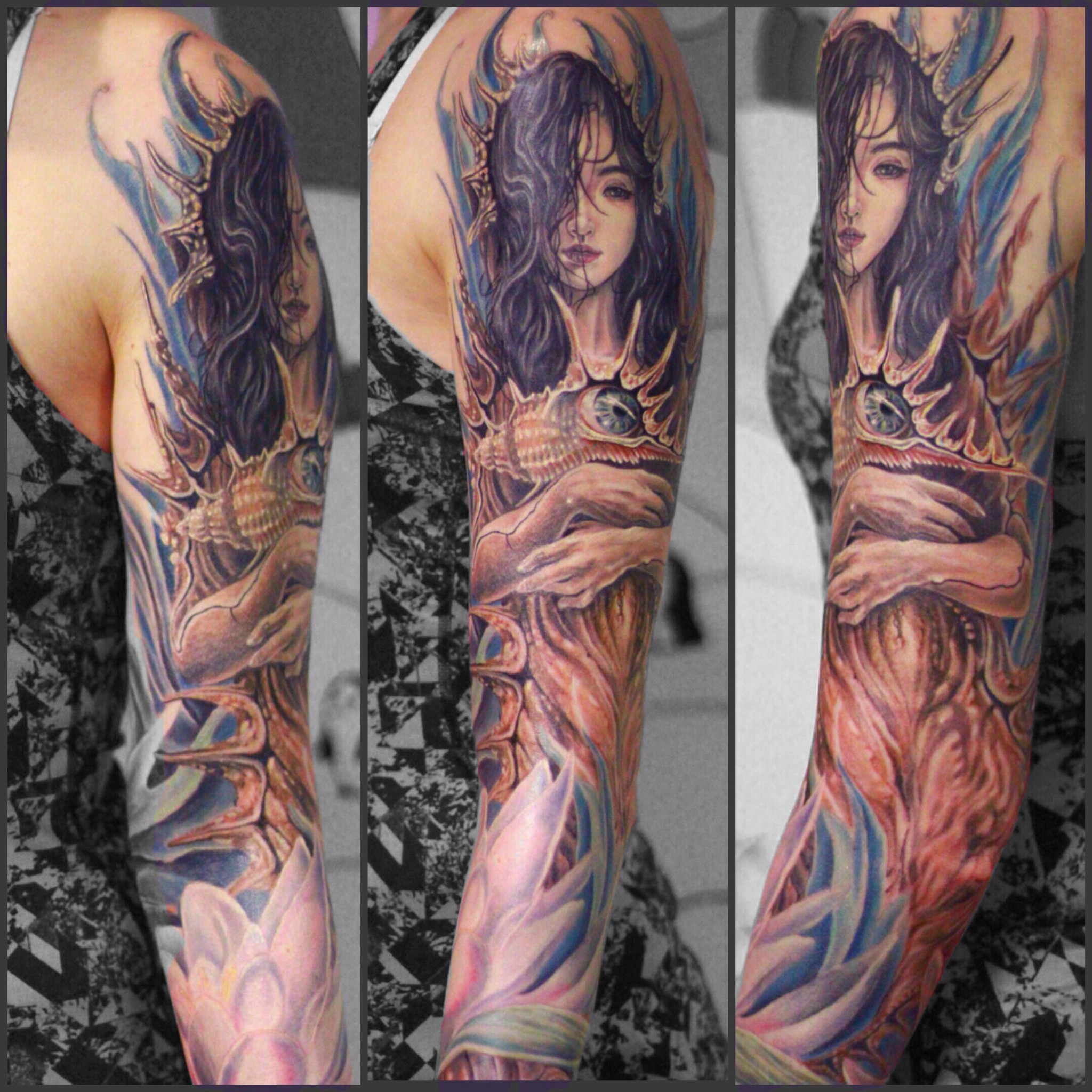 В России я работаю исключительно по собственным эскизам или фотографиям. Для меня татуировка как искусство в большей степени проявляется именно в разработке эскиза, а не в копировании изображения на кожу. Последнее скорее можно расценивать, как мастерство. Также мне нравится работать без эскиза, рисовать непосредственно на самом теле перед сеансом. В дальнейшем я планирую больше подобной практики.
