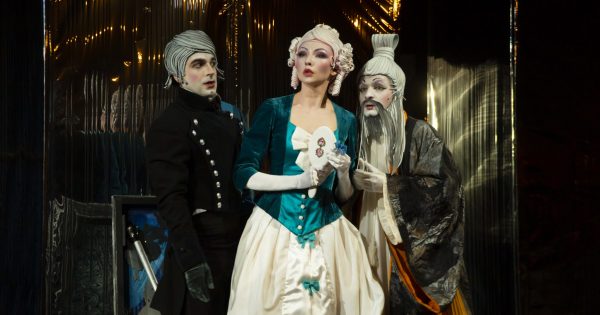 Сценографическое решение Максима Обрезкова в виде синего занавеса со звёздочками используется режиссёром для создания эффекта театра в театре. Здесь становятся видны правила игры – мы все помним, что мы в театре. И та дистанция между артистами и их персонажами даёт им пространство для импровизации и забавных ремарок. Яркое исполнение, костюмы и грим только способствуют отстранению. Поэтому первая часть захватывает, ритм спектакля всё время идёт по нарастающей, артисты прекрасно существуют в происходящем, а атмосфера сказочности иногда подкрепляется внезапными золотыми блёстками и блестящим песком (вроде бы тривиально, однако работает). Про великолепную работу Владимира Логвинова скажу отдельно – найденная им пластика и голос своего персонажа вкупе с характером балагура, его обаятельность и способность к остроумным импровизациям делают его жемчужиной «Волшебного театра…». Порой из-за него прощаешь откровенные недоработки. Если вы пользуетесь гримом, ну неужели нельзя было полностью отбелить шею актрисе? Героиня поворачивается профилем, и я вижу чёткую границу между гримом и чистой кожей. Получается такая «культура фасада».