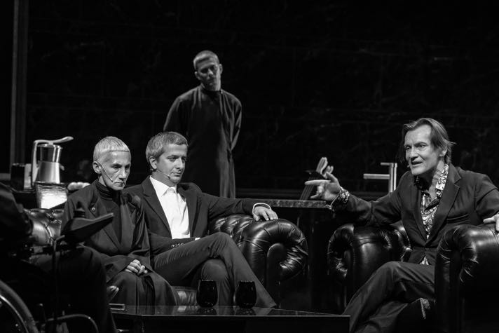Речь пойдёт о том, что традиционно можно назвать спектаклем, или театральным представлением, но, на самом деле, таковым не являющимся. Думаю, что все возможные претензии к этому действу происходят именно из-за того, что зритель, даже самый умный, самый подготовленный, ожидает увидеть спектакль в классическом и привычном его виде, как это сложилось, начиная с начала XIX века. Само действо происходит в МХТ, в доме Станиславского и Немировича-Данченко. Стены обязывают именно так и воспринимать «Карамазовых» Константина Богомолова. Но стены стенами, а само действо из этих стен «выламывается». Это и не спектакль в классическом понимании, и не инсценировка романа. Искать в «Карамазовых» несовпадения с классическим текстом бессмысленно. Перед нами Достоевский, пропущенный через призму восприятия неординарного художника.