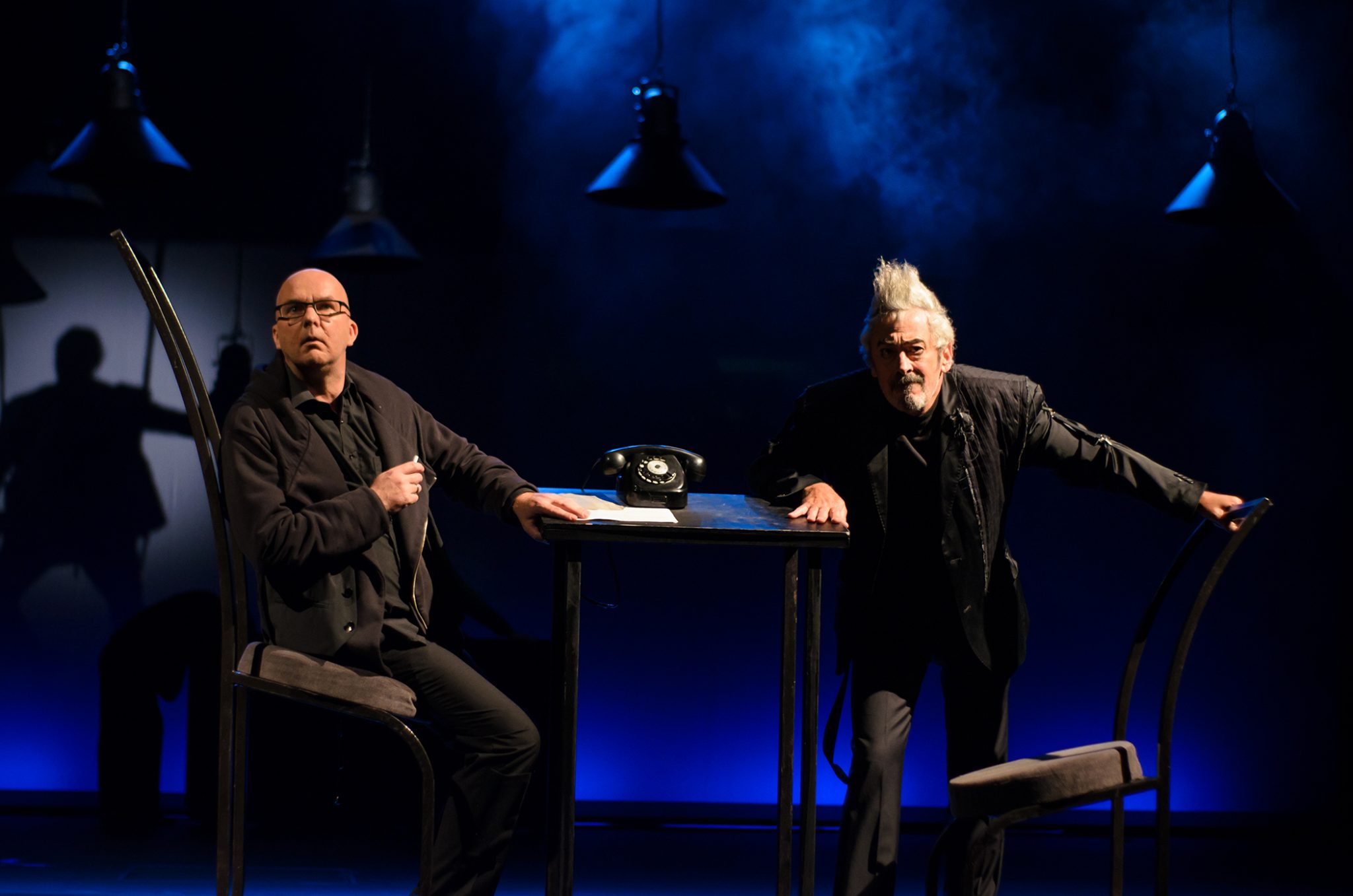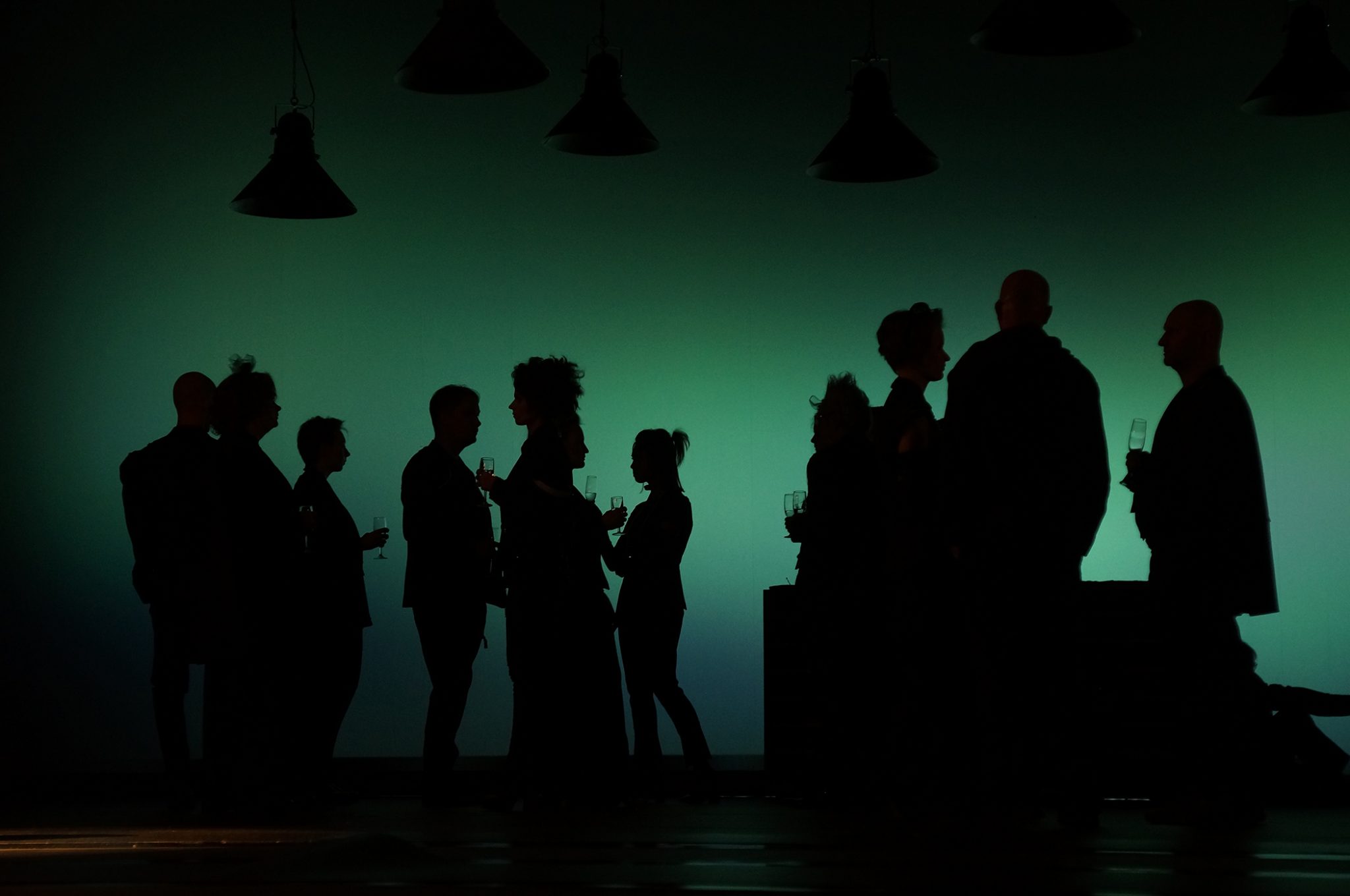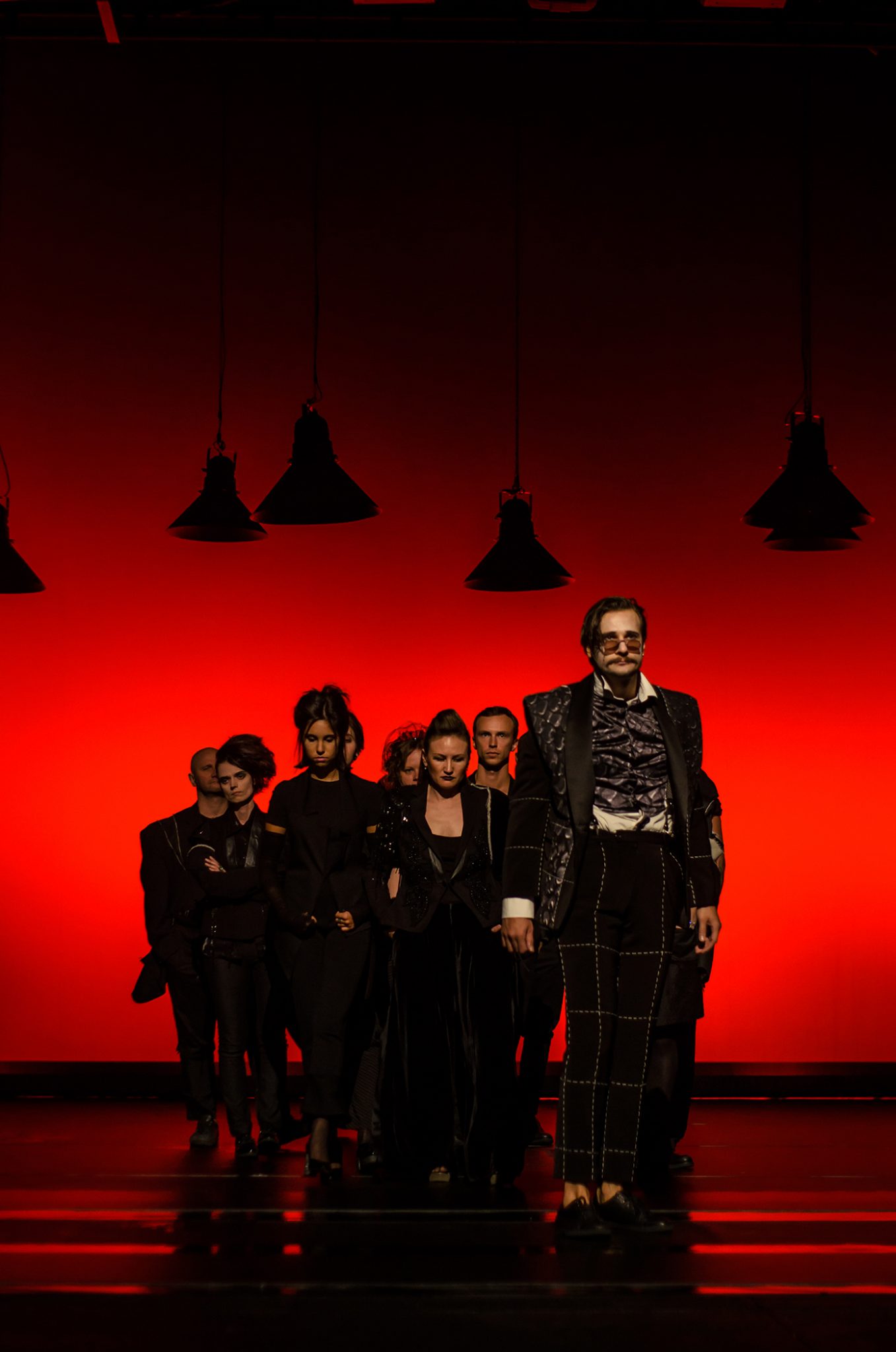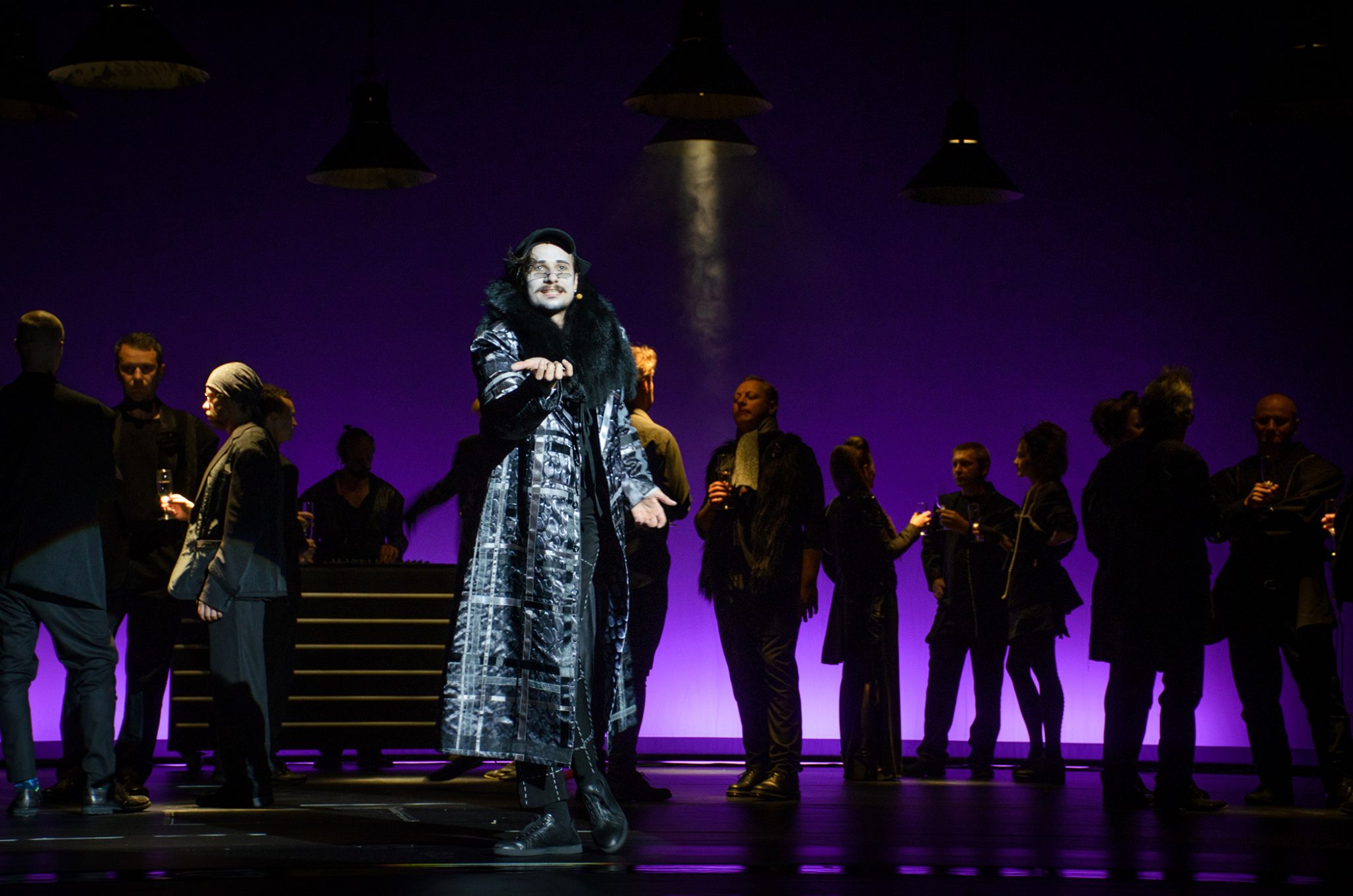 Решение спектакля меня впечатлило — весь первый акт на основной сцене стоял ди-джей за пультом, перед ним маячили темные фигуры людей с коктейлями, занятые беззвучным разговором. Порой они начинали одновременно кивать головами, что создавало чисто «киношный» эффект непрерывного движения в кадре. Три зайца убиты наповал — 1) Постоянная динамика на сцене, 2) Свежая неповторимая идея, 3) Абсолютно понятная трактовка. Ведь в данном контексте встреча Берлиоза и Бездомного с Воландом выглядит как разговор на модной вечеринке литераторов. Берлиоз тут, к слову, похож на стереотипного критика — узкие брючки, шарфик вокруг шеи, разговаривал он томно, растягивая гласные. Ни слова не изменено, при том картина полностью отличная от беседы на Патриарших прудах. Вот, как надо осовременивать!
