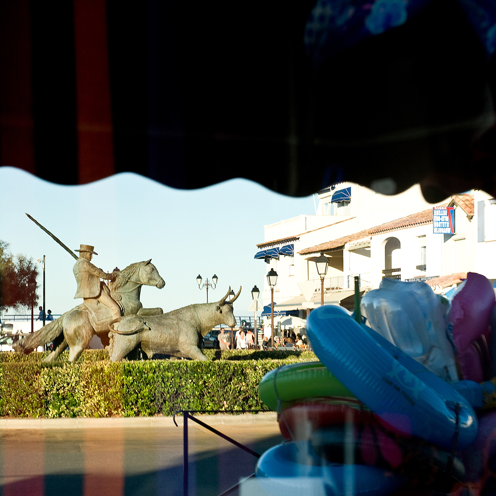 Не могу сказать, что они мне дороги, это не тот случай. Я воспринимаю эти фотографии как набор декоративных элементов, как гирлянду на новогодней ёлке. Кстати, из них действительно можно сделать гирлянду или какую-нибудь дизайнерскую конструкцию с зеркалами. Уже были такие мысли, но до воплощения не дошло. Есть, конечно, в этой серии кадры, которые мне нравятся больше других. Ну, например, фото с отражением фигуры быка и фото с витриной закусочной. Они сняты в Камарге, на самом юге Франции, в городке Сент-Мари-де-ля-Мер, накануне того дня, когда там подул мистраль. В тот вечер был пронзительный, глубокий свет.