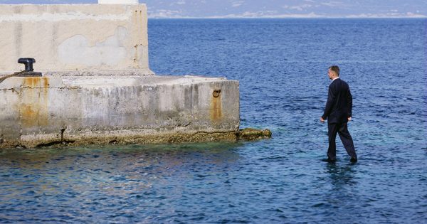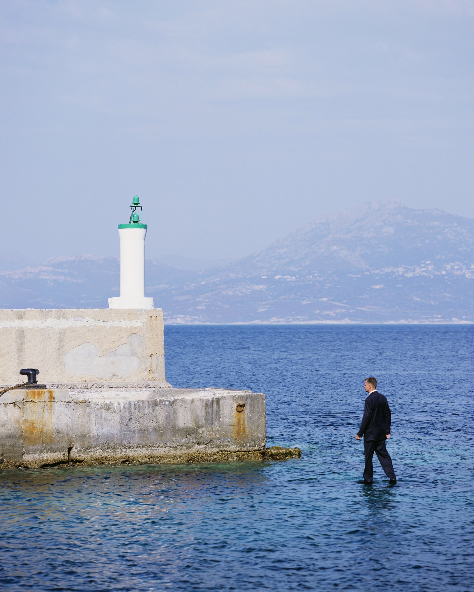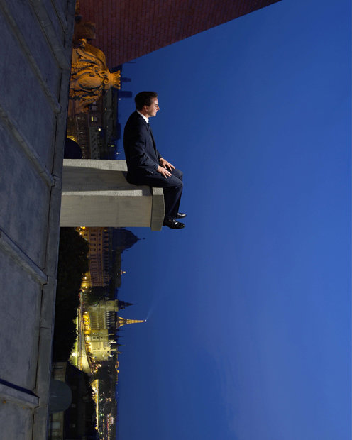 Для этого снимка был взят водонепроницаемый сосуд, который послужил огромным нетонущим поплавком. А сверху, с помощью крана, поместили балкон, оборудованный специальными поддержками и креплениями для рук. После установки всех приспособлений поднялся сильный ветер. Автора то и дело накрывало волной, но он мужественно и терпеливо возвращался в привычную позу и ждал удачного кадра. Ведь еще в середине 90-х он увидел эту фотографию во сне, а теперь она хранится в его коллекции.