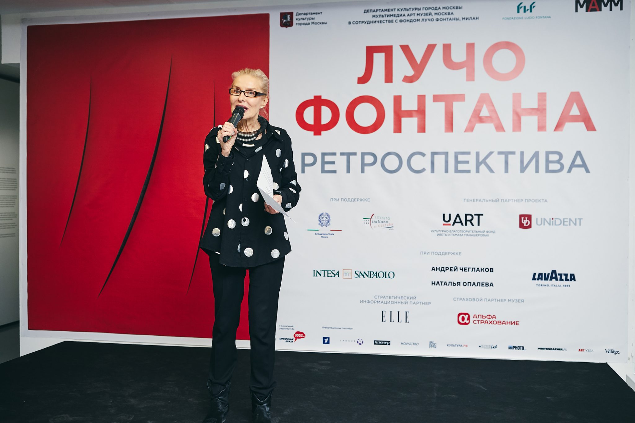 «Лучо Фонтана для меня – учебник того, как мы можем меняться, как мы можем выходить в другое измерение и предугадывать. Ведь ещё в конце сороковых он делает дырки в холсте, которые показывают, что за нами что-то есть», - рассказала директор Мультимедиа Арт Музея Ольга Свиблова.