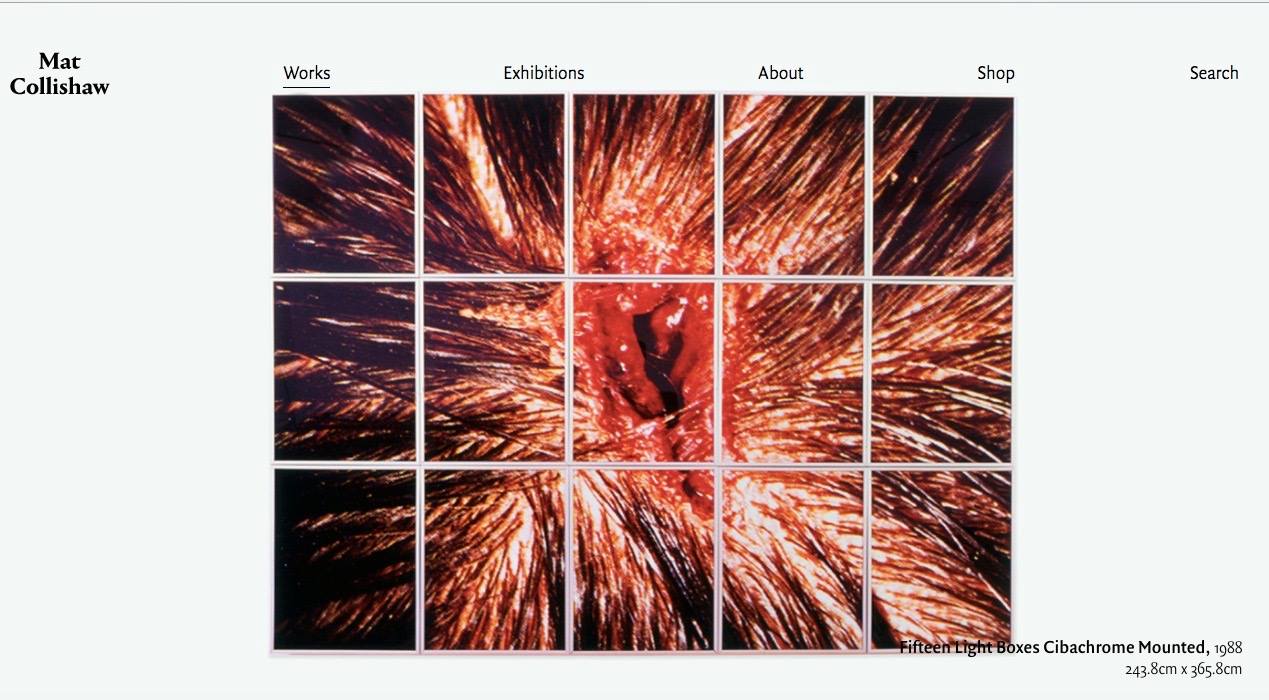 Мэт Коллишоу – современный художник, участник легендарного движения Young British Artists. Молодые британские художники (YBA) - исторически сложившееся название само-организованной группы художников из Великобритании, большинство из которых учились в Голдсмитском колледже в Лондоне. Ключевыми и наиболее известными среди них были и остаются такие фигуры, как Дэмиен Хёрст, Трейси Эмин, Крис Офили, Сара Лукас, а также Марк Куинн, который дал своё определение YBA: «Молодые британские художники» — это просто географическое стечение обстоятельств. Так получилось, что все они появились в Лондоне в один и тот же период, и их работы покупал Чарльз Саатчи. Но это очень разные художники. Может быть, единственное, что нас связывает — это то, что мы пытались привнести в искусство реальность, а не делали просто искусство об искусстве». Точкой отчёта для Коллишоу стала, как и для остальных молодых британцев, выставка Freeze 1988 года, организованная другом и соратником Дэмиеном Хёрстом. На ней была показана одна из ранних шокирующих работ начинающего художника Bullet Hole - пазл из 15 лайтбоксов, изображавших что - то похожее на отверстие от выстрела в голову, а на самом деле - рану, нанесённую ледорубом.