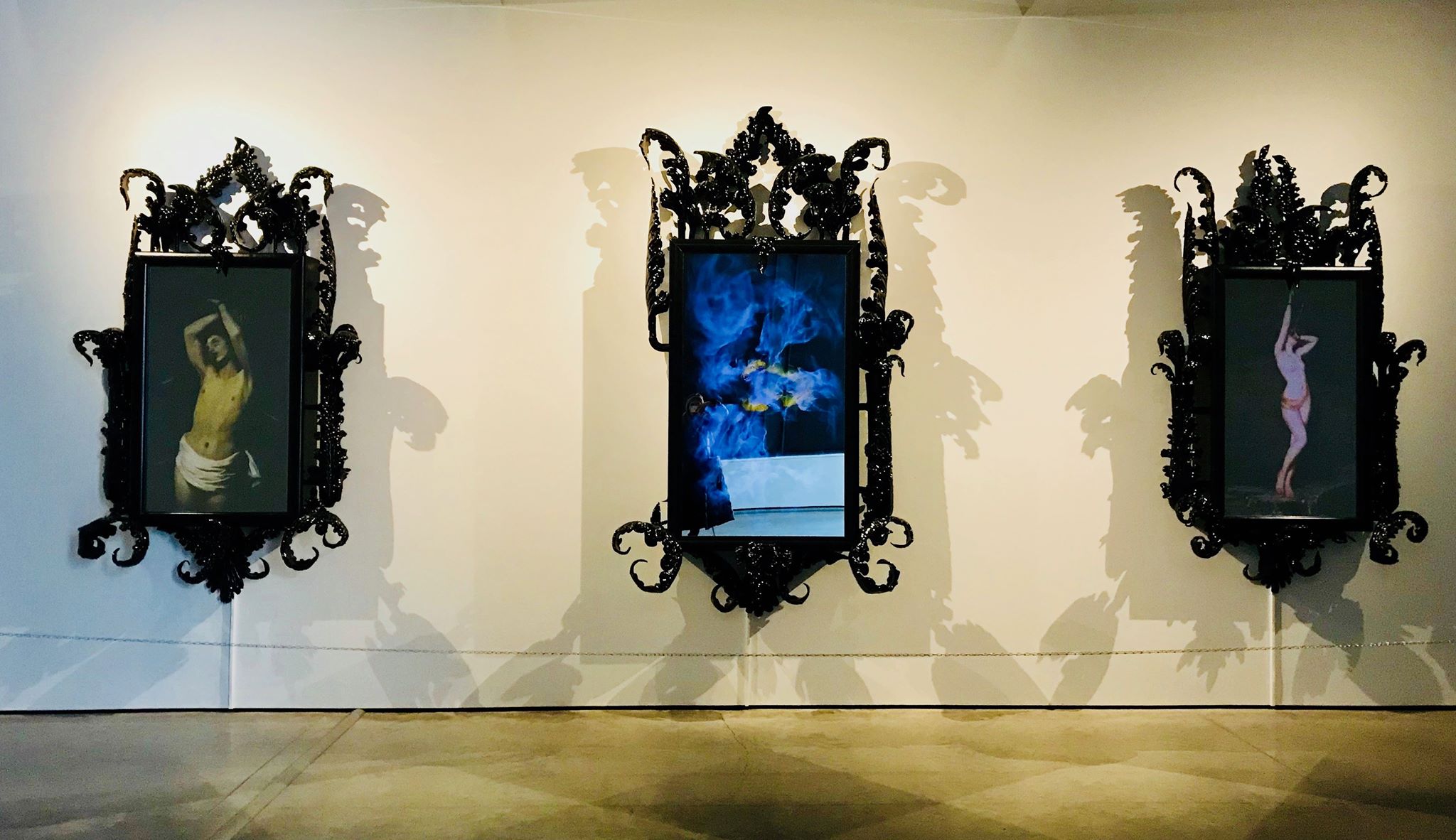 Например, на чёрную жемчужину экспозиции, которой стала серия работ под названием Black mirrors. Проект, начатый Мэтом Коллишоу ещё в 2014 году, был призван вести диалог с произведениями классиков в стенах хранилищ мировых шедевров искусства, чтобы в каждой работе отражался сам музей. В зеркалах, обрамлённых чёрным муранским стеклом, подобно призракам прошлого появляются и исчезают образы Св. Себастьяна, мифической Андромеды и хранителя потустороннего мира - в образе жёлтого змея.