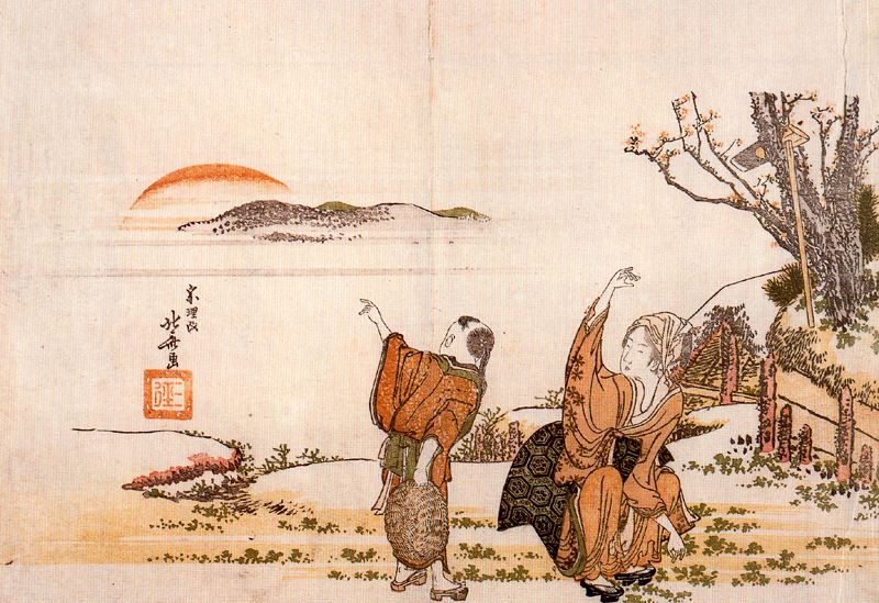 Кацусика Хокусай родился значительно позже первой европейской экспансии в Японию, в 1760 году. Но в своем позднем творчестве он первым из японских гравёров заинтересовался «перспективными картинами», после чего написал трактат об особенностях европейской живописи.