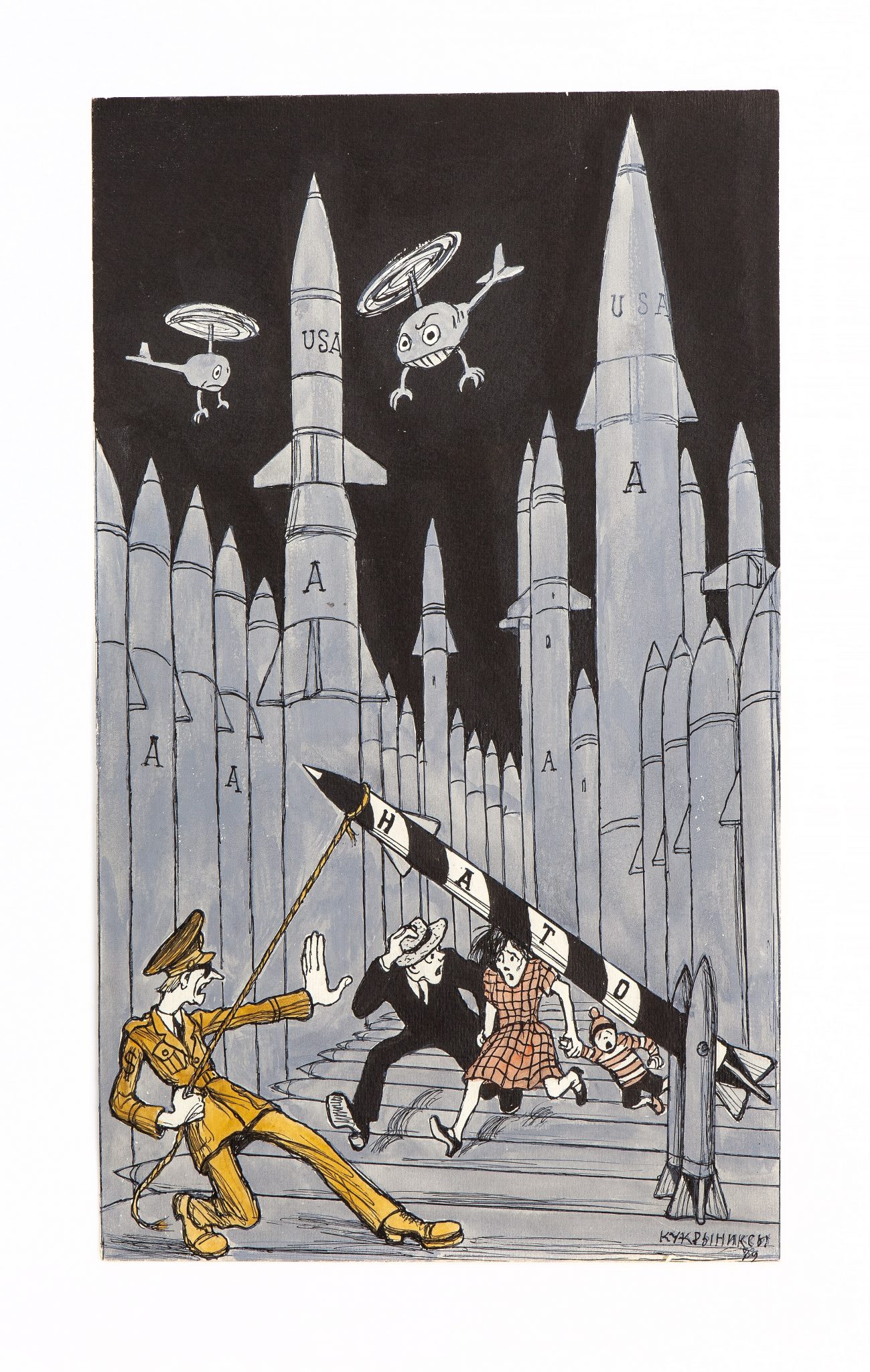 Была развёрнута гонка вооружений, началась эпоха локальных военных конфликтов в Азии, Африке, Латинской Америке, на Ближнем Востоке. В карикатурах всесторонне раскрыта суть плана Маршалла, процесс создания НАТО под руководством США, возрождение неофашизма, Карибский кризис, война во Вьетнаме и Афганистане, создание ядерного оружия и угроза его применения. Через карикатуру «Кукрыниксов» мы узнаём главные действующие лица эпохи, а также внешнеполитические события, в которых они играли ключевую роль.