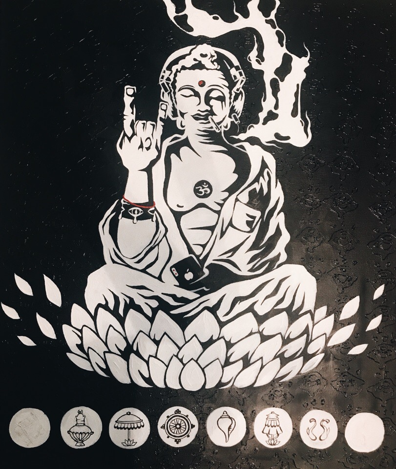 Artifex: Еще я видела у тебя интересный холст, где изображен Будда с айфоном в руке, «козой», в наушниках и сигаретой. Что обозначает этот образ?