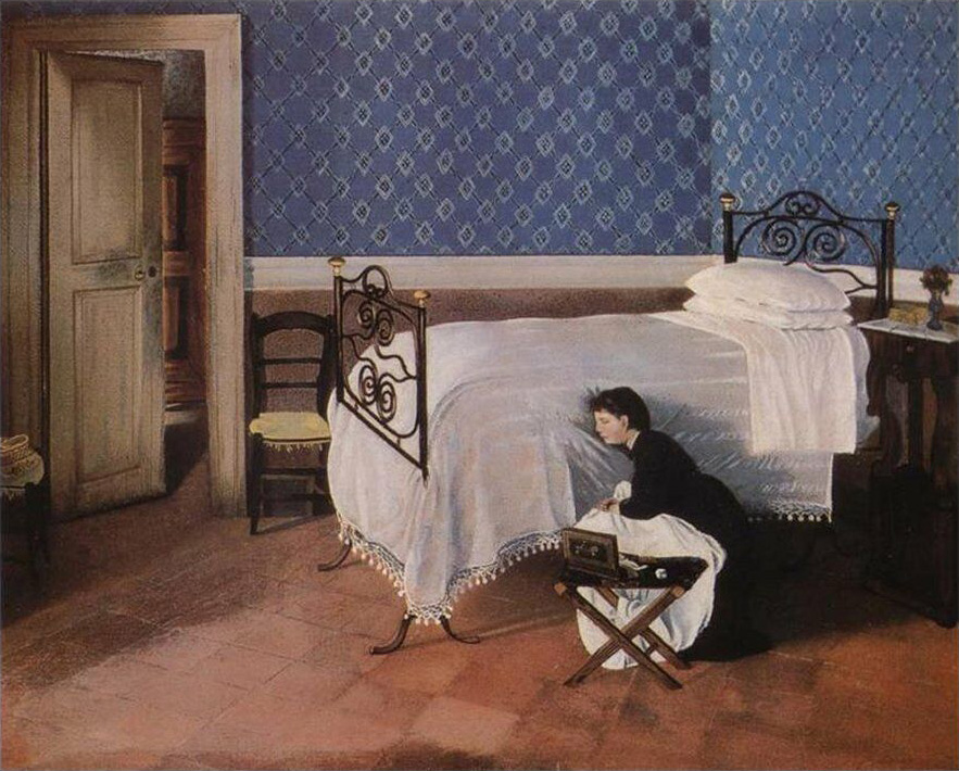 Housework (1869) – картина более светлая. Не из-за того ли создаётся такое впечатление, что на холсте изображён ребёнок? Или это солнечные лучи, разливающиеся по интерьеру, придают всему полотну ощущение радости, приподнятого настроения? Так или иначе, но зритель может полюбоваться будничным занятием – работой по дому.