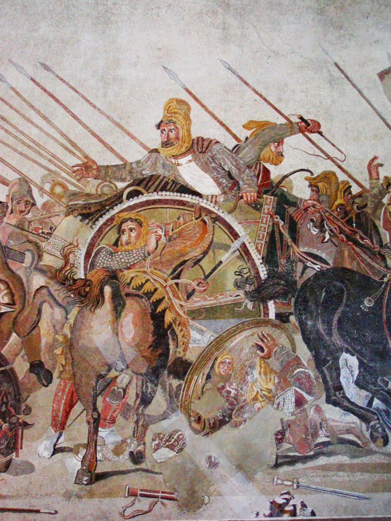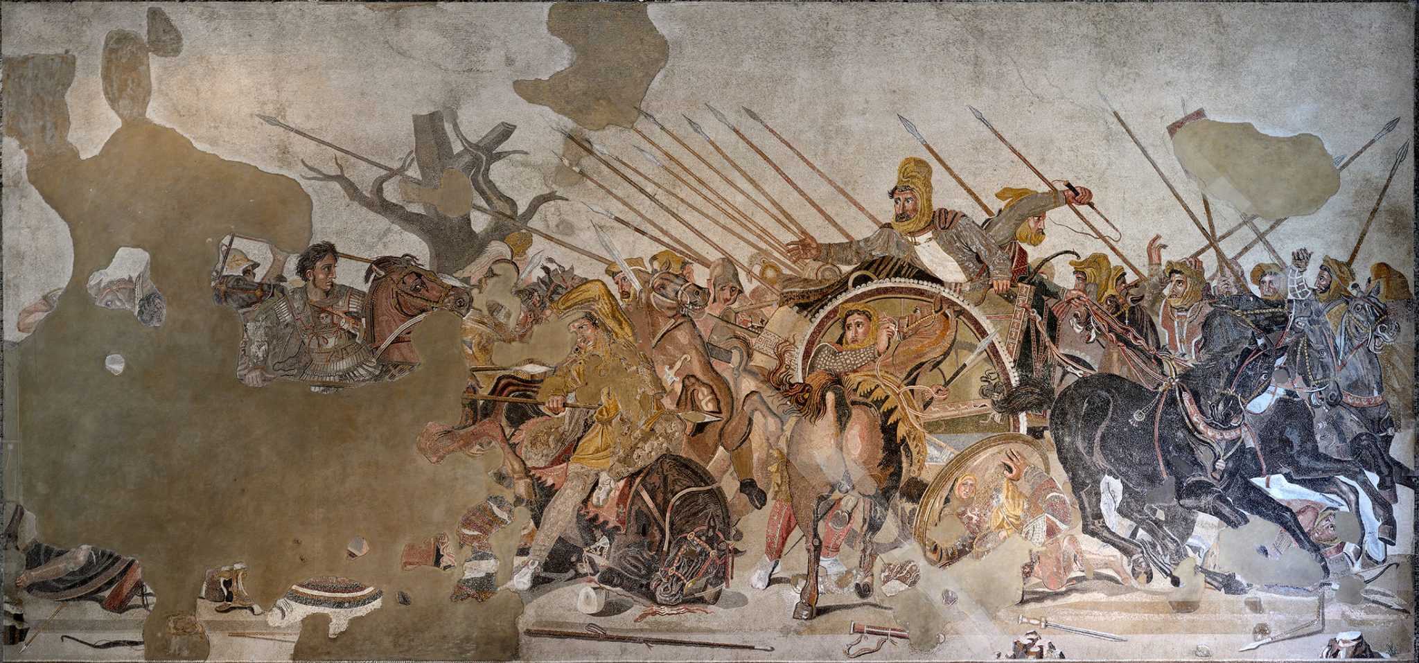 Эта битва задолго до Альтдорфера уже нашла своё отражение в живописи. Речь идёт о знаменитой мозаике в римском городе Помпеи, погребённом под пеплом Везувия. Опять Судьба, опять Фатум, опять вечный конфликт между человеческой самонадеянностью и властью Природы, властью Высших сил. Можно сделать даже смелое предположение, не погубила ли все Помпеи именно эта мозаика, не навлекла ли она гнев богов на сам город? Ведь молодой царь Македонии только и делал, что бросал вызов Судьбе, вызывая зависть богов. Мозаика была обнаружена 24 октября 1831 года при раскопках античных Помпей в Италии на полу одного из помещений дома Фавна и перенесена в 1843 году в Национальный археологический музей Неаполя, где и хранится по настоящее время.