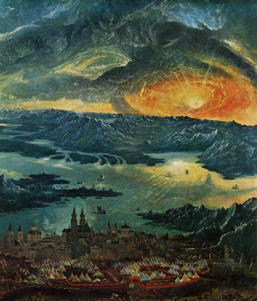 Там, в самом верху картины, происходит своя битва. Солнце заходит, и всё ярче становится серп луны. Солнце и луна, появившиеся одновременно, — древний символ события мирового значения. Свет и Тьма ведут борьбу не менее драматично, чем люди. Солнце склонилось к горизонту, из последних сил отражая натиск полной тьмы, ползущей оттуда, куда бегут побеждённые персы. Так есть победа или нет? Или это всё причудливая игра Судьбы? Картина была написана в тот момент, когда турецкие войска Сулеймана Великого стояли у самой Вены. Даже после победы Александра Восток вновь напомнил о себе, и герцог Баварский собирается воевать с турками и просит художника создать соответствующее полотно вдохновляющего содержания. Но политический заказ он воплощает по законам высокого искусства, где царствуют лишь одни противоречия и недосказанность. Кажется, Альтдорфер и сам не способен понять до конца смысл происходящего. Ему незнакома уверенность людей Средневековья в безусловной правоте одной из сражающихся сторон (той, с кем Бог). Миром его картины управляет не благой Творец, а Слепая Судьба.