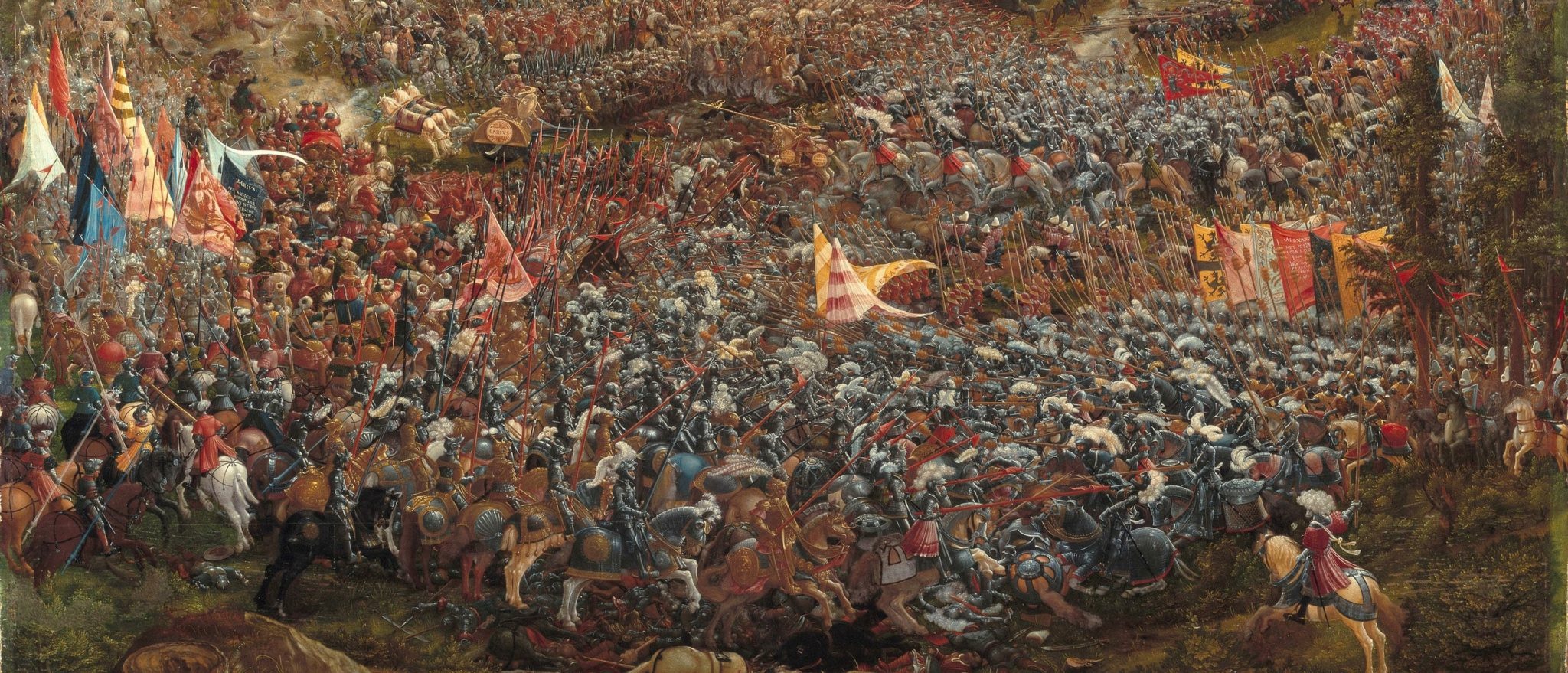 Великий Уччелло в своей «Битве при Сан-Романо» явно ориентировался на нечто подобное знаменитой помпейской мозаике. Там также всё изображено крупным планом и никакого пейзажа в виде фона. Но Учелло — это искусство Флоренции XV века. А Альтдорфер создаст свой шедевр уже в двадцатых годах XVI века, то есть намного позднее. И если Учелло — это лишь первые попытки работы с линейной перспективой, то Альтдорфер творит в эпоху, когда всего несколько лет назад умер Леонардо да Винчи. И линейная перспектива уже успела показать зрителю все свои возможности в области создания как воображаемого, так и реального пейзажа. Альтдорфер буквально заворожён этим открытием.