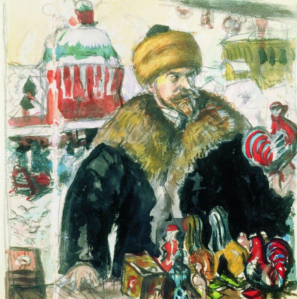 В 1906 г. Кустодиев пишет картину «Ярмарка». Ей он открывает целый цикл, посвященный этому явлению. Полотно заставляет погрузиться в динамичный ярмарочный мир. Живые эмоции захватывают зрителя, и он становится как бы непосредственным участником действа. В центре картины – двое стариков. Кажется, словно один рассказывает о покупке валенок, которые держит подмышкой. Возможно, он объясняет за сколько купил их. Чуть левее стоит женщина и выбирает грабли. Торговец ненадолго отвлекся от нее, чтобы поговорить с другим покупателем. На подобном торгу может обсуждаться цена товара и его лучшие качестве. Торговец стремится продать его как можно выгоднее для себя. Это происходит под ярмарочный гул. Картина словно шумит, веселится.