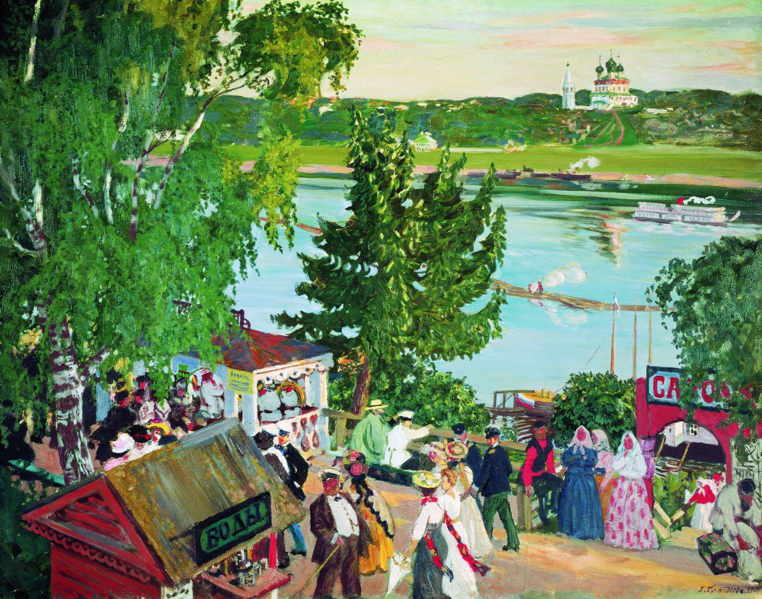Художник часто изображал не только народные гуляния, но и беседы светских людей. Русский народ отличался своей пестротой, которую стремился запечатлеть Кустодиев. Подобной многоликостью обладает картина «Гуляние на Волге». На ней изображены светские дамы с лентами и цветами, щеголи, одетые по последней моде. Эта работа, как и предыдущая, наполнена звучанием. На таких прогулках молодые люди и барышни могли встретиться, обсудить последние новости и обменяться любезностями.