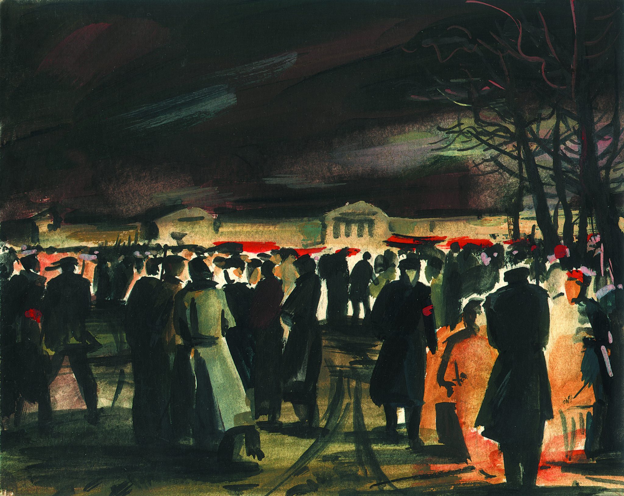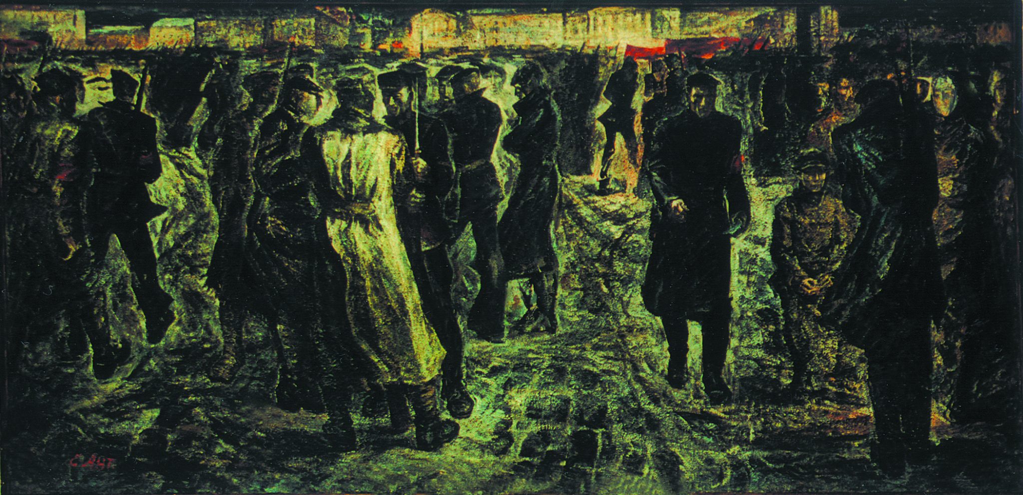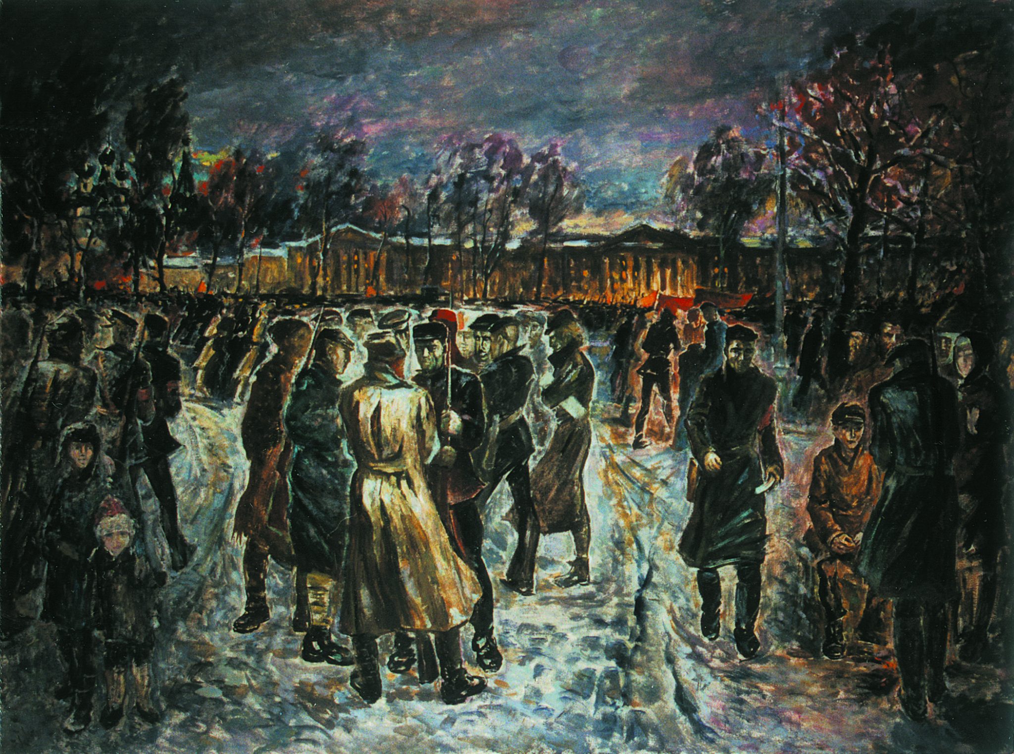 На примере трех картин с названием «Солдаты революции» можно проследить как менялась не только техника художника, но и его мысли по поводу всего сюжета. Первый вариант был написан в 1955 году, в ранний период творчества. Здесь фигуры и здание размыты, половину холста занимает темное небо. О нем сложно что-либо сказать, перед нами только эскиз композиции, которая в дальнейшем осталась практически неизменной.