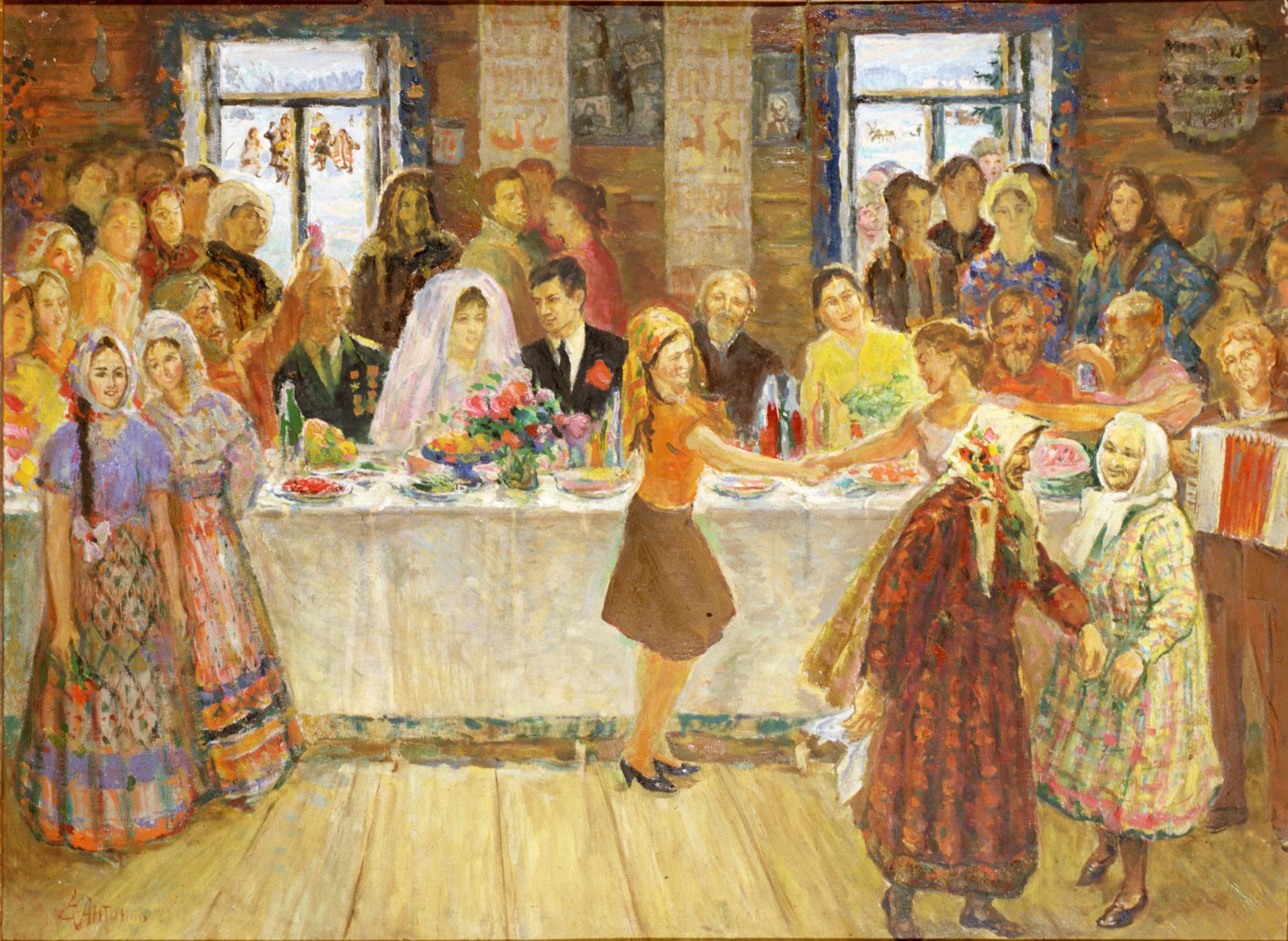 У Антонова отлично получались и бытовые сцены, самая удачная, на мой взгляд — картина «Свадьба в Ханты-Манси». Перед нами свадебное застолье в деревенском доме. Среди многочисленных родственников есть все поколения. Совсем юные счастливы, событие вызывает у них радость, они танцуют перед гостями. Люди постарше играют на музыкальных инструментах или просто стоят вокруг стола. Им нельзя сесть, потому что за столом места для людей старшего поколения и молодоженов.