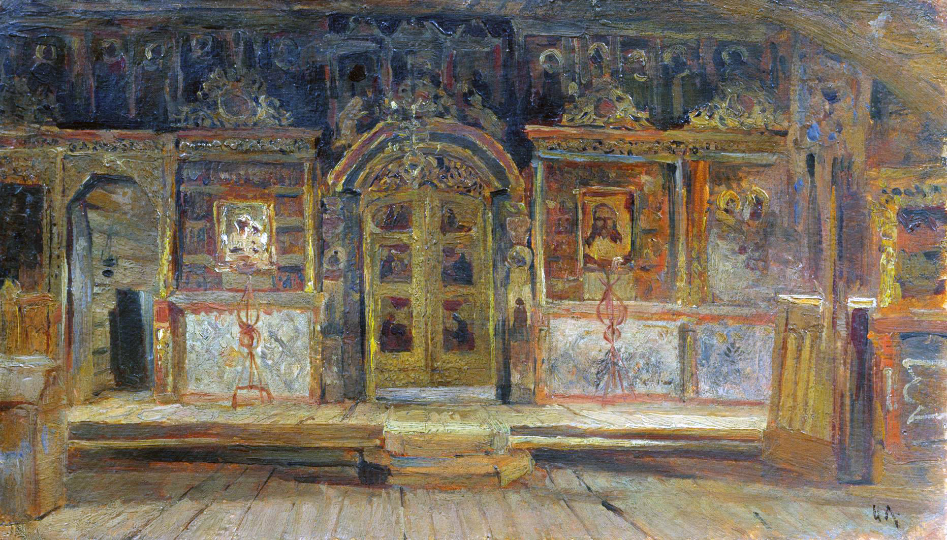 Красное, цвета свечи, одеяние алтаря, сгустившийся под потолком мрак монастырской кельи, дальше нужно домыслить: пахнуло ладаном, услышали пение отца Якова, служившего обедню. Левитан списывает ветошь иконостаса и внешний вид церкви, но чуть менее удачно. Третьякова это интересует.