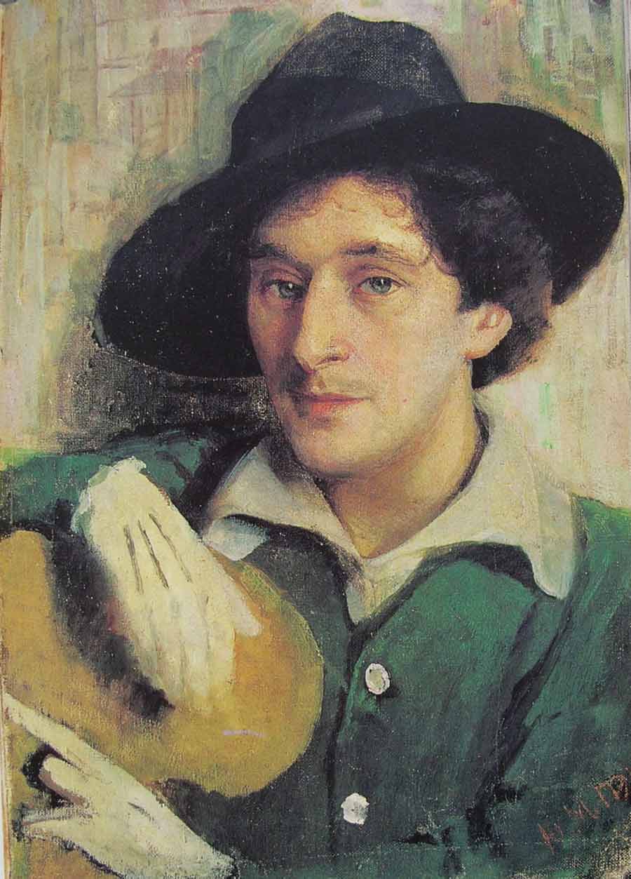 Настоящий сатирик всегда одинок – он безжалостен к себе и окружающим. Прежде всего - к себе. Себя Шагал рисует искаженным, почти с заячьей губой, можно подумать, что он себе отвратителен. Долгожитель, покоривший Монпарнас, и робкий ненавязчивый юноша, с лицом «белым как мел». Скромный сельский учитель и большой художник Иегуда Пэн таким представляет его на своем портрете: и рубашку надел зеленую, и в руки дал палитру, словно лиру Ваганту, и узнаваемая синева от бритвы Дяди Зюси.