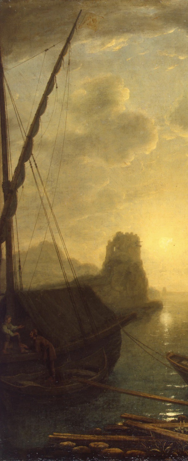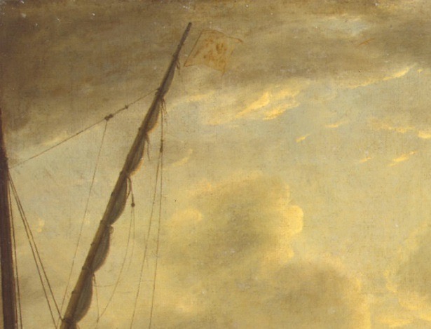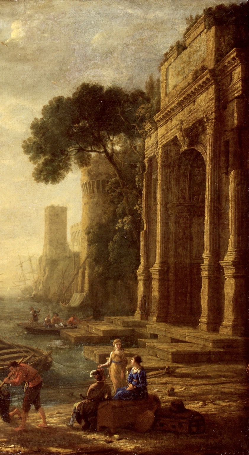 Стоит сказать, что это вымышленный пейзаж. Лоррен брал реальные архитектурные сооружения и переносил их в другое пространство. В данном случае справа расположена Триумфальная арка Тита (та, что стоит рядом с римским Колизеем), а за ней, как я могу допустить, судя по гравюрам XV- XVI веков — оборонная стена неаполитанской гавани. Практически во всех публикациях, что я читал, авторы крепят герб рода Боманур (заказчика этой картины) на мачту корабля. Но этот корабль — бизань французского типа с латинским парусом. И герб висит не на мачте, а на рейке.