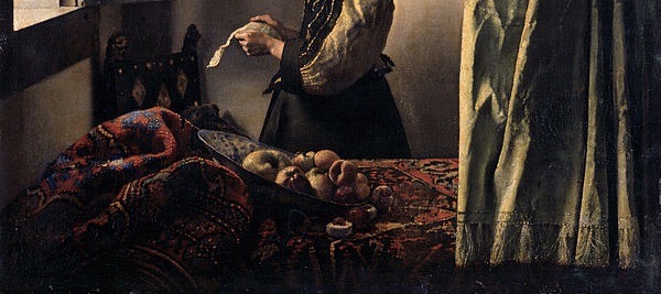 На картине изображена молодая женщина. Её лицо абсолютно статично, взгляд устремлен в письмо. Необходимо приблизить изображение, чтобы уловить легкую вибрацию уголков её полных губ, ноздрей и глаз. Неподвижность говорит о заинтересованности. Она желает сохранить это послание в тайне. Можно смело утверждать, что содержание письма носит интимный характер. На это указывает ряд общепринятых условностей: на переднем плане мы видим пару ближневосточных ковров ручной работы — дорогое удовольствие и сегодня — символ достатка. О том, что девушка из высокого рода говорит и деревянный стул в углу комнаты. Такая мебель стоила очень больших денег. Делфтское (по названию места – г. Делфт) фаянсовое (керамическое) блюдо с фруктами, рассыпанными под углом, и надрезанный персик говорят о текущей интимной связи. Как и кучно лежащие яблоки — вечный символ греха.