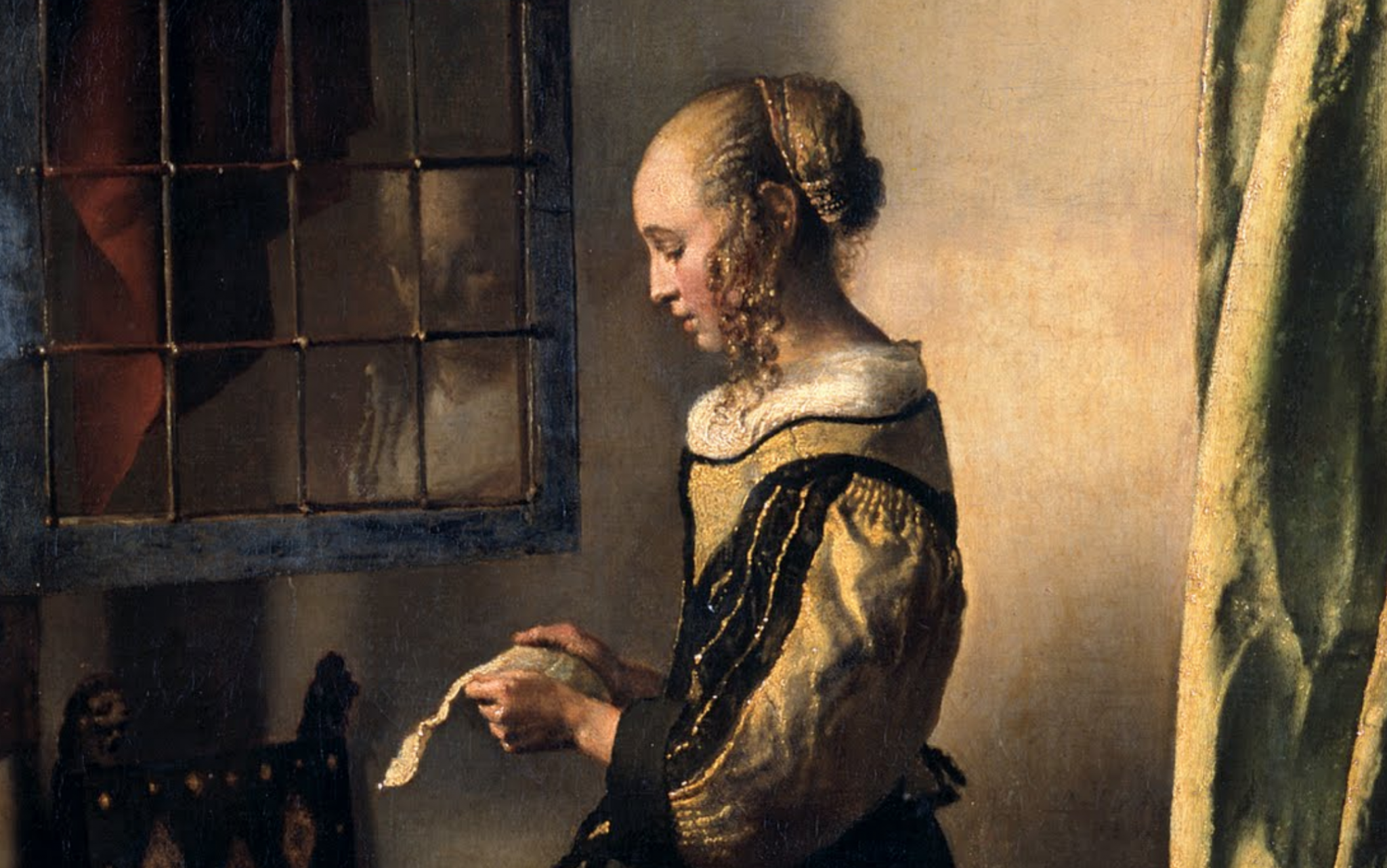 Когда я наконец понял, что это письмо, а не куриная кожа, то представлял себе, что его принесло ветром. Порыв ветра распахнул окно и письмо упало к её ногам. Но так как волосы девушки статичны, эта теория была отброшена. Можно даже предположить, что день за окном довольно солнечный. И в письме, возможно, приглашение на вечернюю встречу? В отражении оконной рамы эмоции тоже считать невозможно. Хотя изначально Вермеер задумывал написать девушку почти спиной и по её отражению мы могли бы догадываться о содержании письма. Но затем по какой-то причине изменил ракурс и отражение стало искаженно-размытым. Кстати, в отражении, то есть в ранней версии работы, было использовано другое платье.