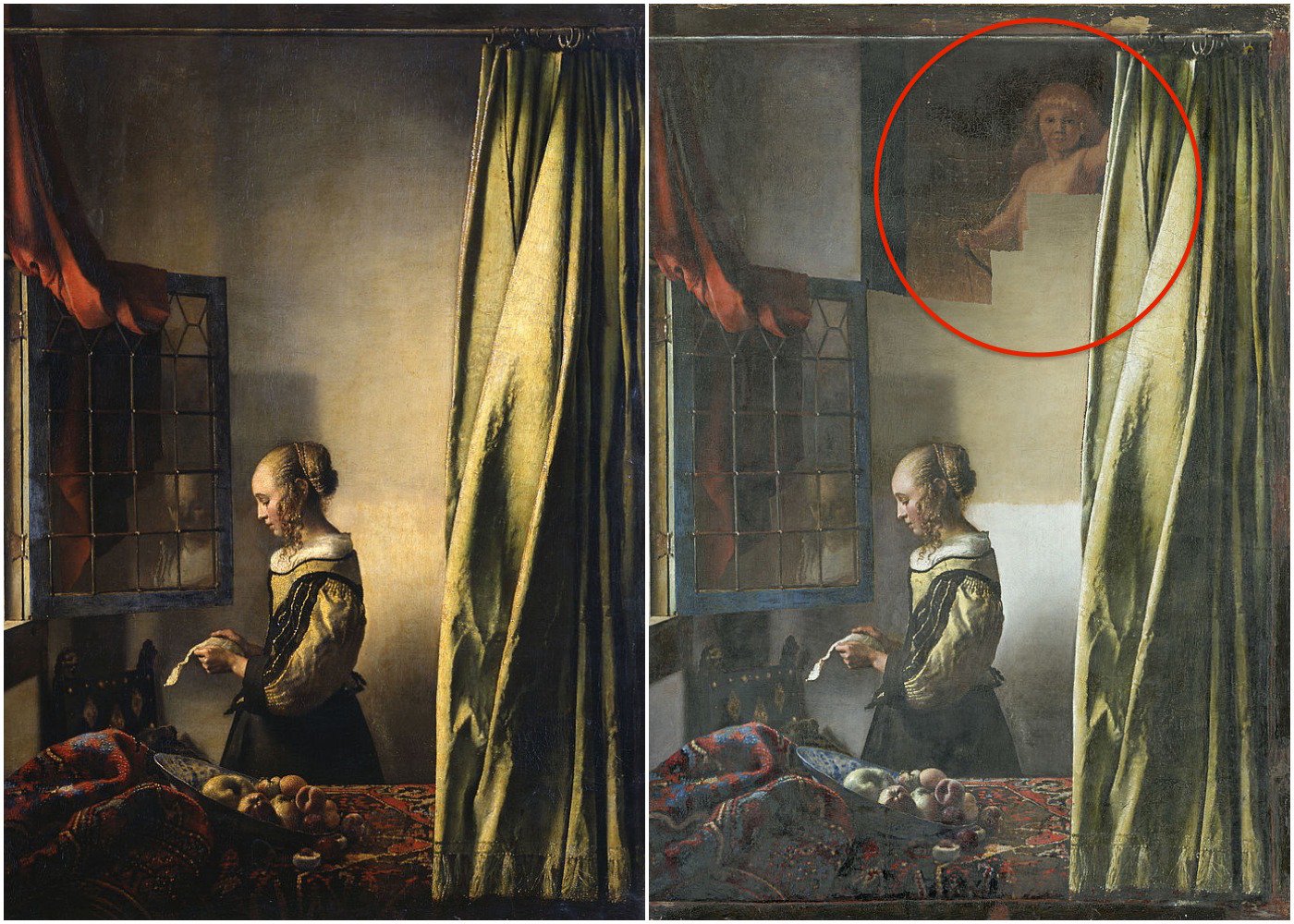 В мае 2019-ого мир облетела сенсационная новость. Реставраторы этой картины обнаружили, что фрагмент вписанной картины с купидоном, который Вермеер расположил на стене позади девушки, был замазан не самим автором, а неизвестным художником по непонятным причинам в XIX веке. Реставраторы сняли краску и выставили картину в оригинальном композиционном ключе.