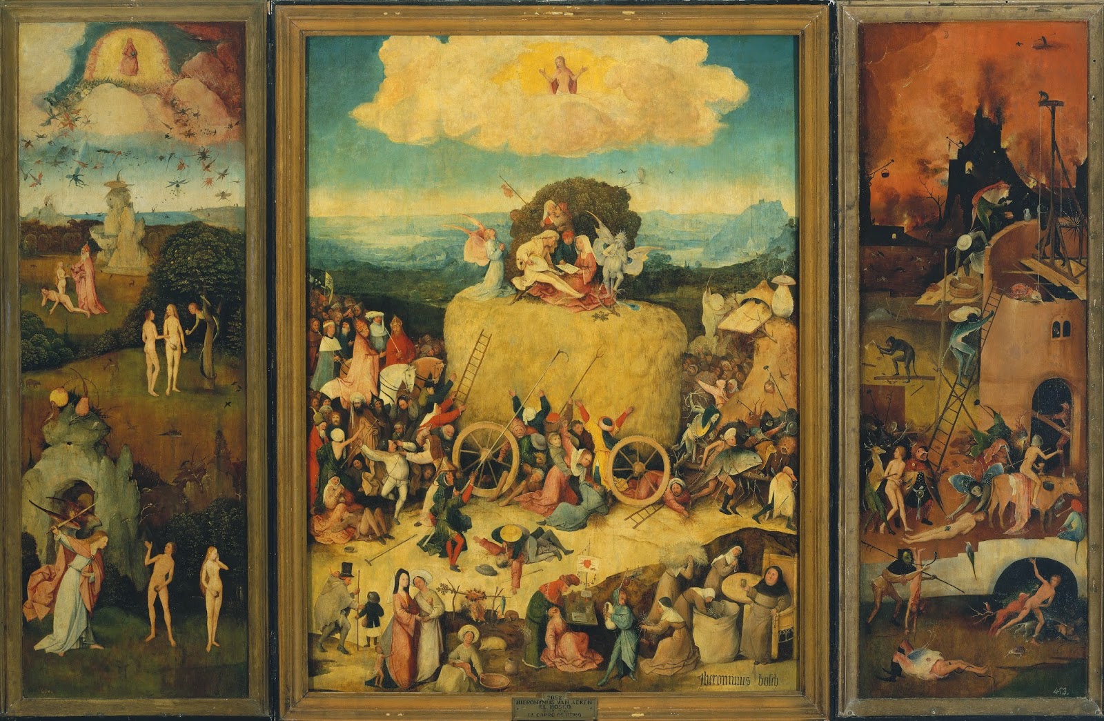 История движется дальше. В центральной части мы видим воз сена. Это, пожалуй, одна из самых интересных аллегорий жизни человека. Мы видим, как все стремятся к тому, чтобы забраться на этот воз. Он - отражение человеческого счастья, идеал, предел мечтаний. Ради своей цели люди убивают друг друга, они дерутся, они готовы оказаться под колесами, быть раздавленными. Все смотрят только на верхушку воза, но никто не видит, что вместо лошадей в повозку запряжены черти. Они катят ее в Ад.