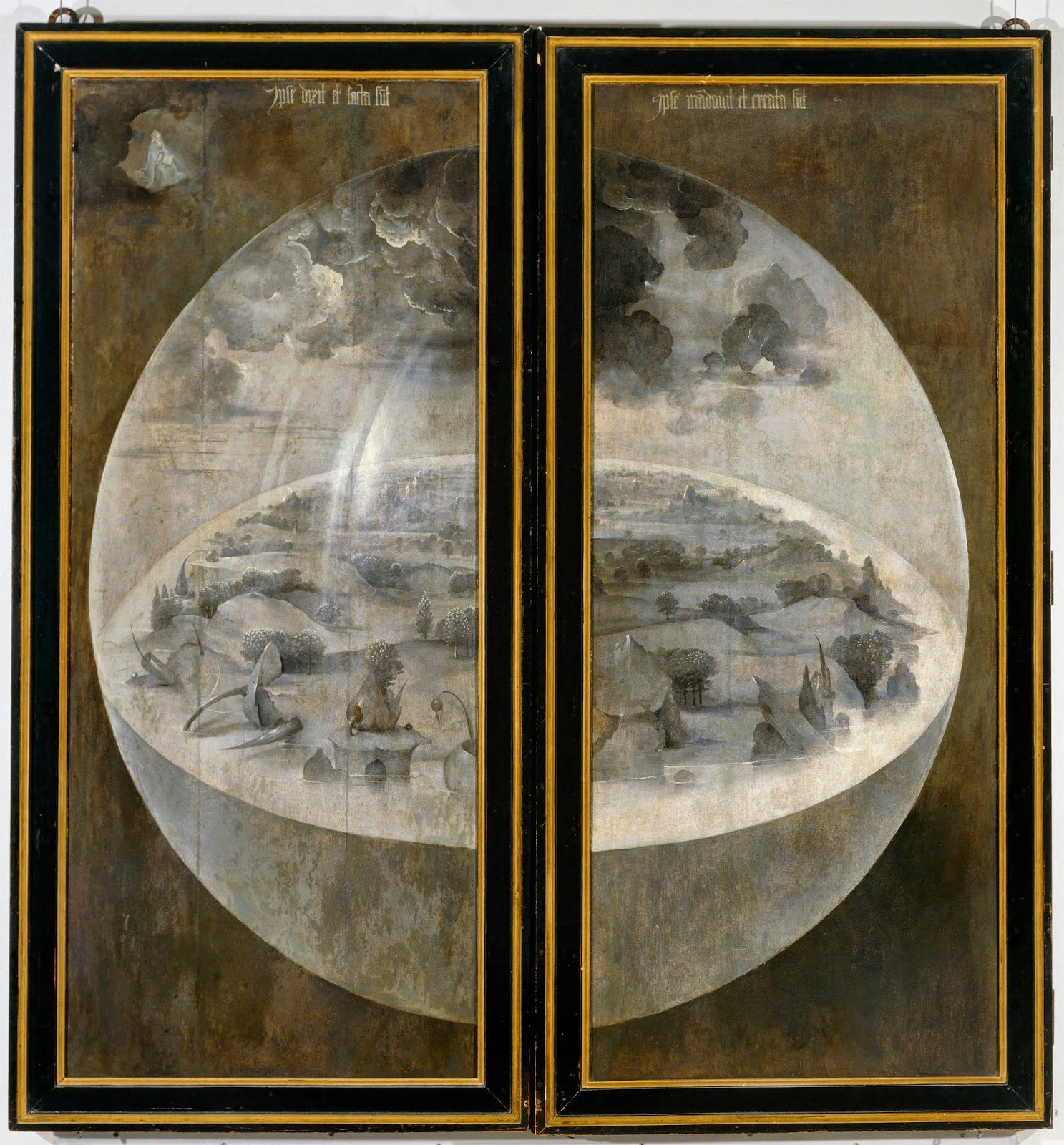 Перед нами снова закрытые створки. Это сцена создания земли. В левом верхнем углу сам Бог, его взгляд устремлен в книгу. В сфере - плоская земля, только что сотворенная им. Мир - это книга, написанная рукой Бога. Две надписи сверху переводятся так: «Он сказал - и сделалось», «Он повелел - и явилось». Перед нами явная отсылка на евангелие от Иоанна и идею о том, что все началось со слова. Мы открываем створки...