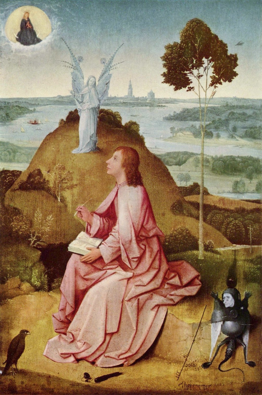 То, что Босх великолепно знал священное писание, подтверждается его необычным изображением предметов и животных, упоминаемых в Библии. Взять например, его картину «Св. Иоанн Богослов на острове Патмос». Что за непонятная фигура расположилась в правом нижнем углу? В чем ее символизм?