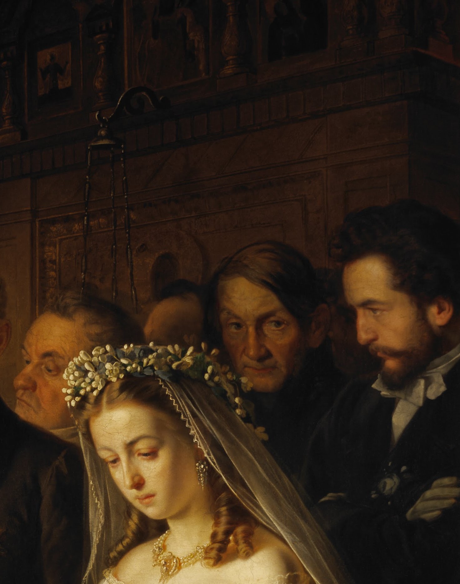 Факт остается фактом. Художники и до Пукирева и после него не раз изображали несчастных молодых невест и их старых богатых мужей. Но такого эффекта полотна не производили. Здесь нет картинного плача, заломанных рук — всего того, что по мнению многих живописцев должно изображать настоящее горе. Тут все куда проще. Невесте вот-вот священник должен надеть кольцо на палец. Она несчастна. Оно и понятно: муж её, мягко говоря, немолод. Такие ситуации бывали часто. Анну Керн, например (ту самую, про которую А.С. Пушкин написал: «Я помню чудное мгновение…»), родители выдали за генерала Ермолая Федоровича Керна, которому на тот момент было уже 52 года. Невесте — всего шестнадцать. Объяснение в любви было по-военному коротким. Генерал Керн спросил Анну: