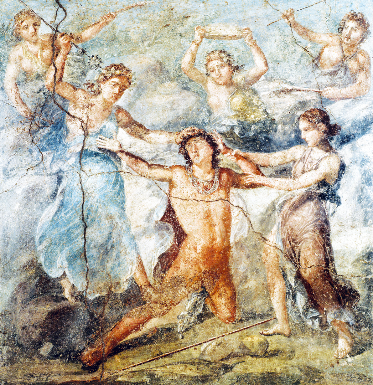 Он шёл на звук труб, льющегося вина и пьяных криков. И вот наконец вышел на поляну в самой гуще событий. Смотрит, а там его мать со своими сёстрами пирамиду из винных бокалов строят. Он смотрит на них, те смотрят на него. «Сёстры!» — кричит мать, — «К нам кабан пришёл, загоним его!» — и показывает на Пенфея. Тот сразу потерял свой пыл и уже на бегу припомнил злополучное предсказание Тиресия. Но просить прощения было уже поздно. Ино вырвала ему одну руку, её сестра — другую, а мать оторвала голову.